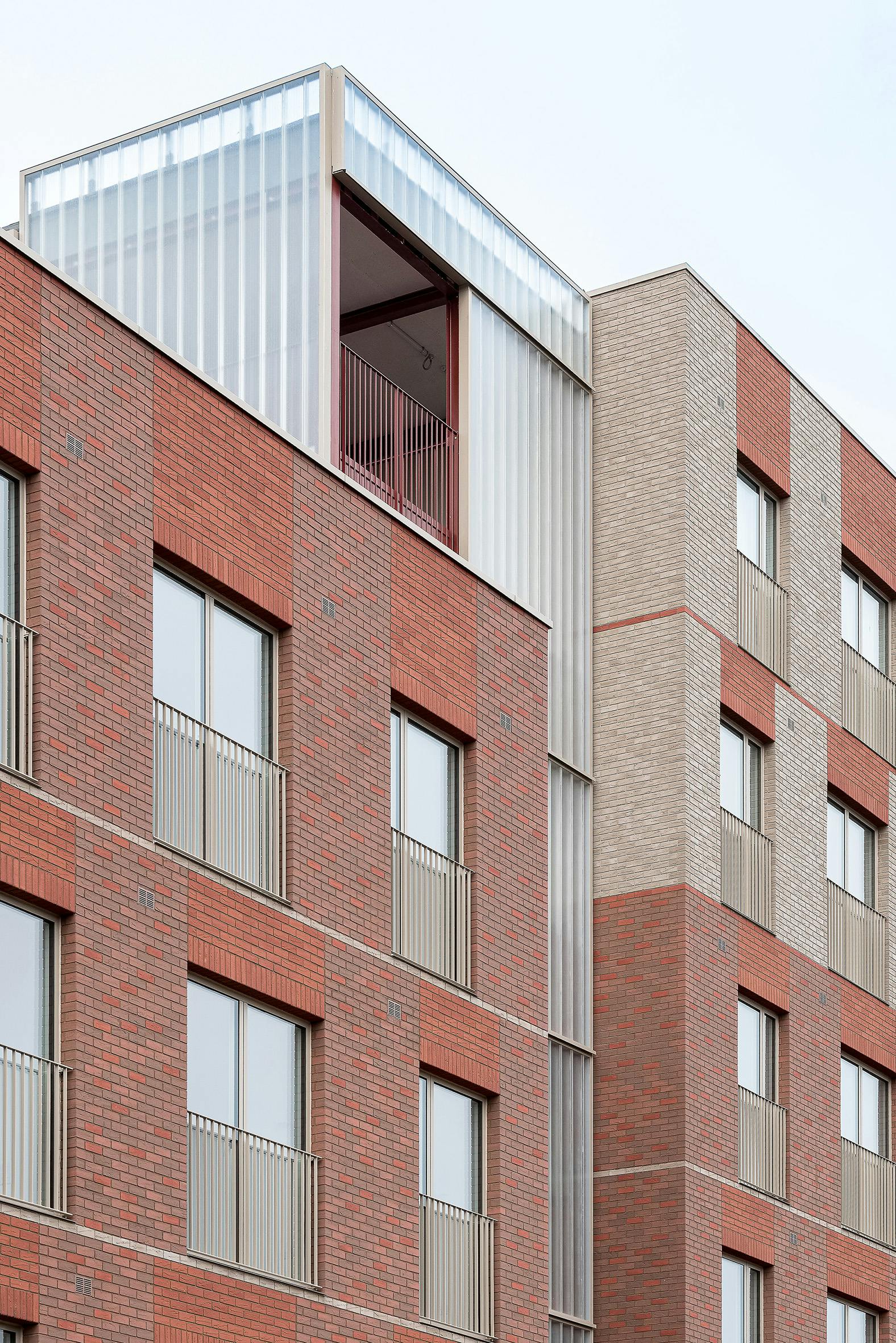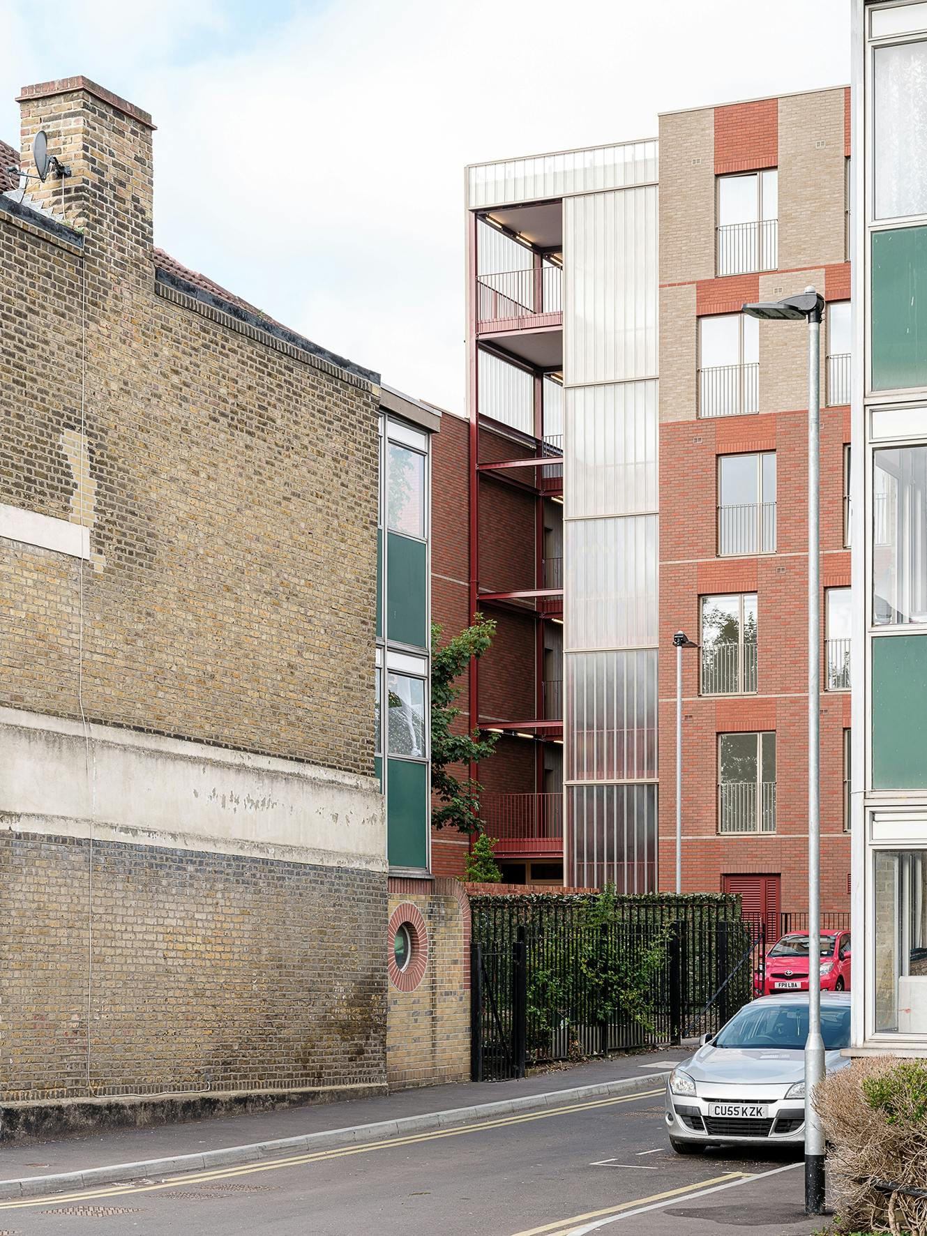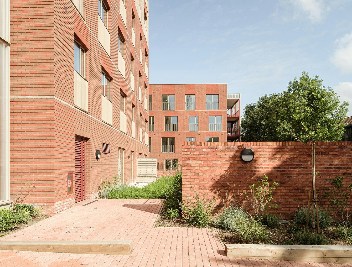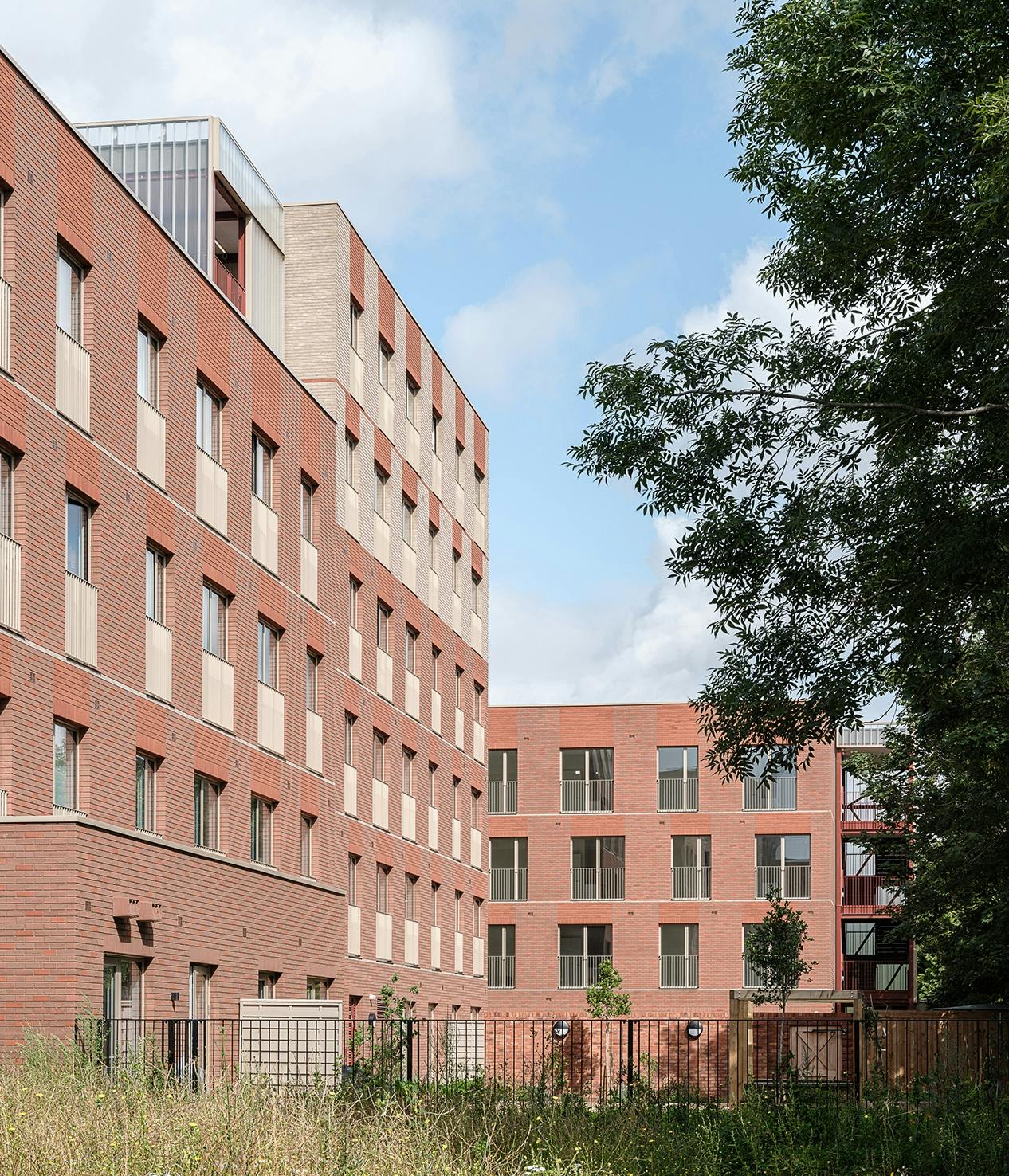 The structure of each of the new blocks has been pre-fabricated off-site to reduce disruption for neighbours. Warm brick colours tie in with those on other buildings in the area, including the Victorian waterworks opposite the site. At the ground floor, the brick base extends from the building to form garden walls and benches. A cast glass façade wraps around circulation spaces to contrast with the texture of the bricks and to allow light into and out of the staircases.