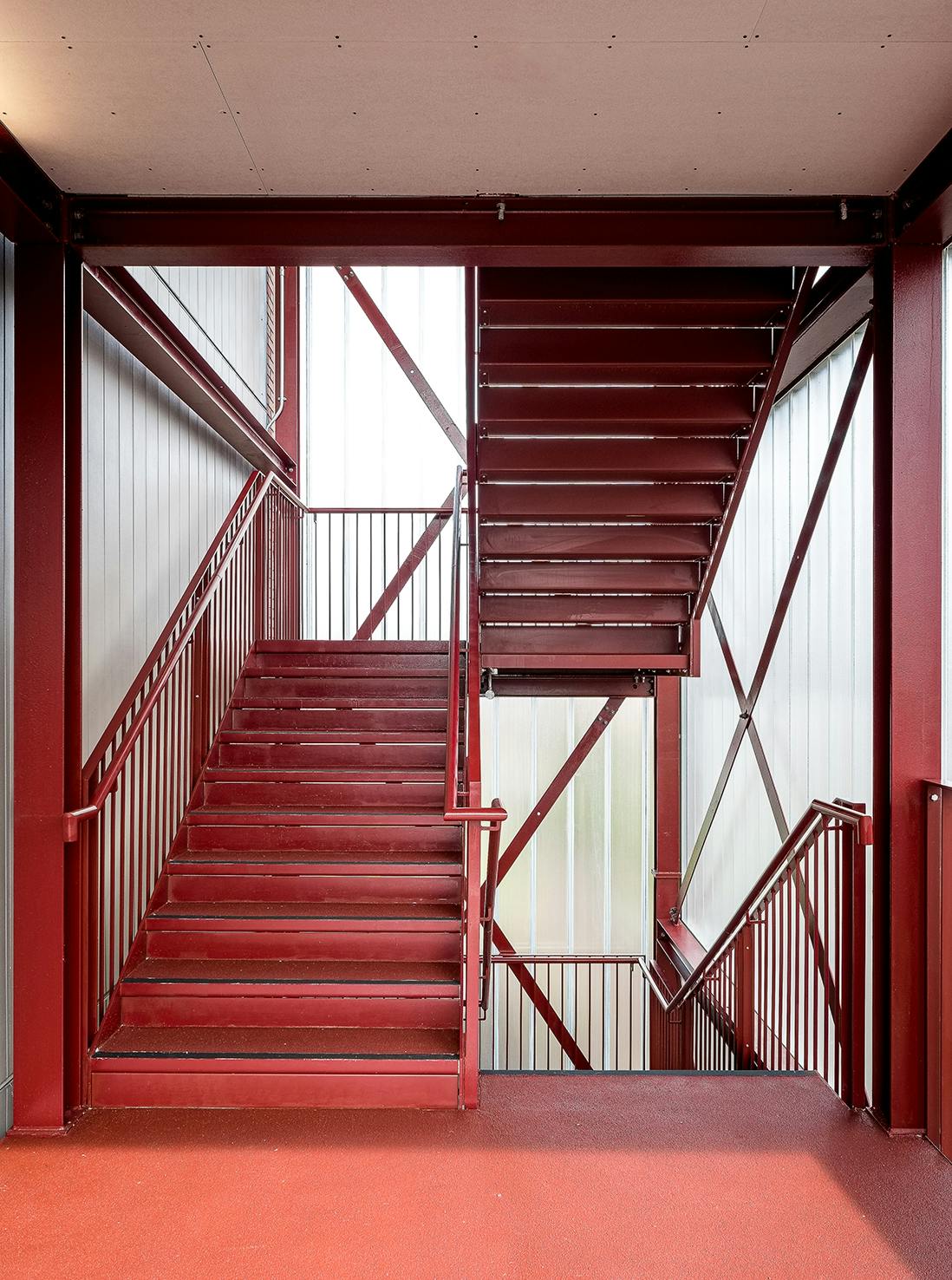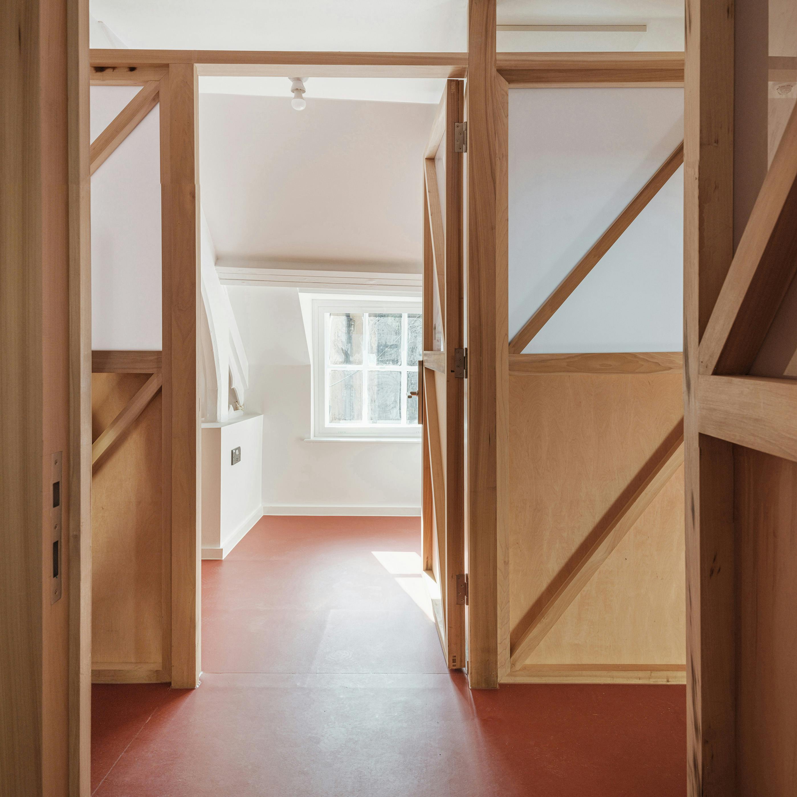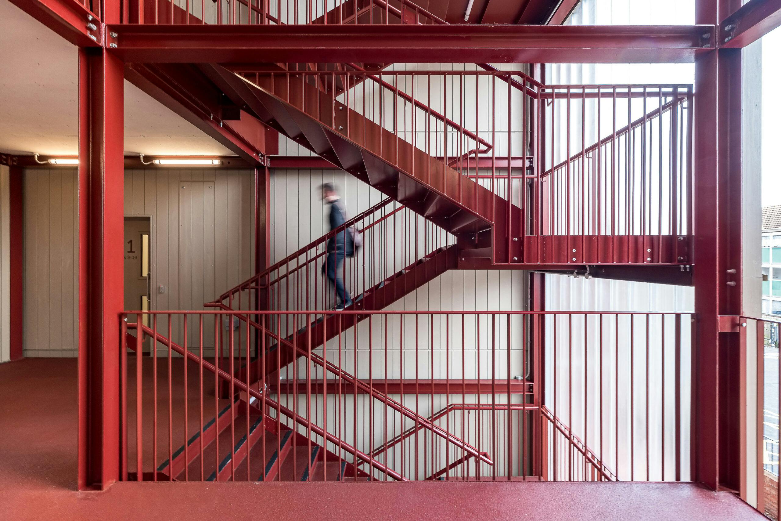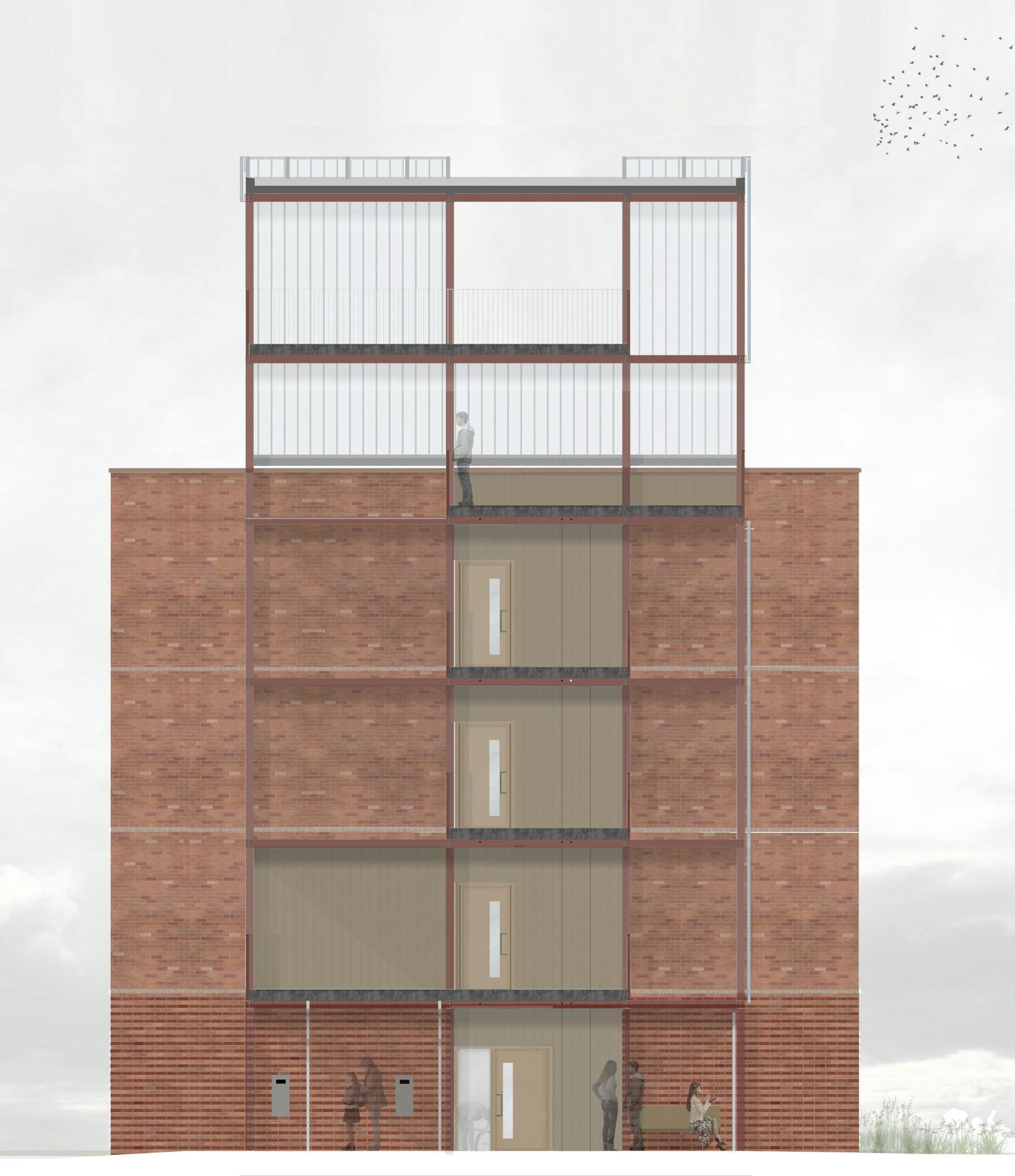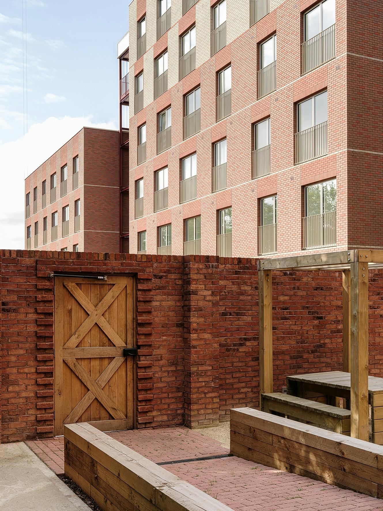 The structure of each of the new blocks has been pre-fabricated off-site to reduce disruption for neighbours. Warm brick colours tie in with those on other buildings in the area, including the Victorian waterworks opposite the site. At the ground floor, the brick base extends from the building to form garden walls and benches. A cast glass façade wraps around circulation spaces to contrast with the texture of the bricks and to allow light into and out of the staircases.