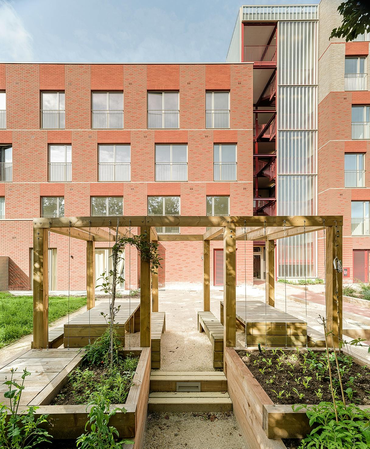 Walled gardens form the heart of the scheme and are influenced by the work of landscape architects such as Gertrude Jekyll. They include allotment space as well as outdoor table tennis and social spaces. The scheme also includes a shared home-working space for all residents to use.