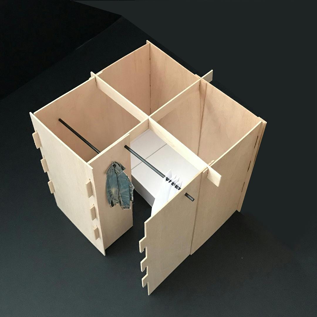 The pods, each measuring approximately 2x2m each, are fabricated from 8 standard plywood sheets using CNC milling technology and are designed to be erected without screws, nails or glue using specially developed interlocking connections. They can be built singly or in a row, with side panels shared with the adjacent pod to reduce the amount of timber required.