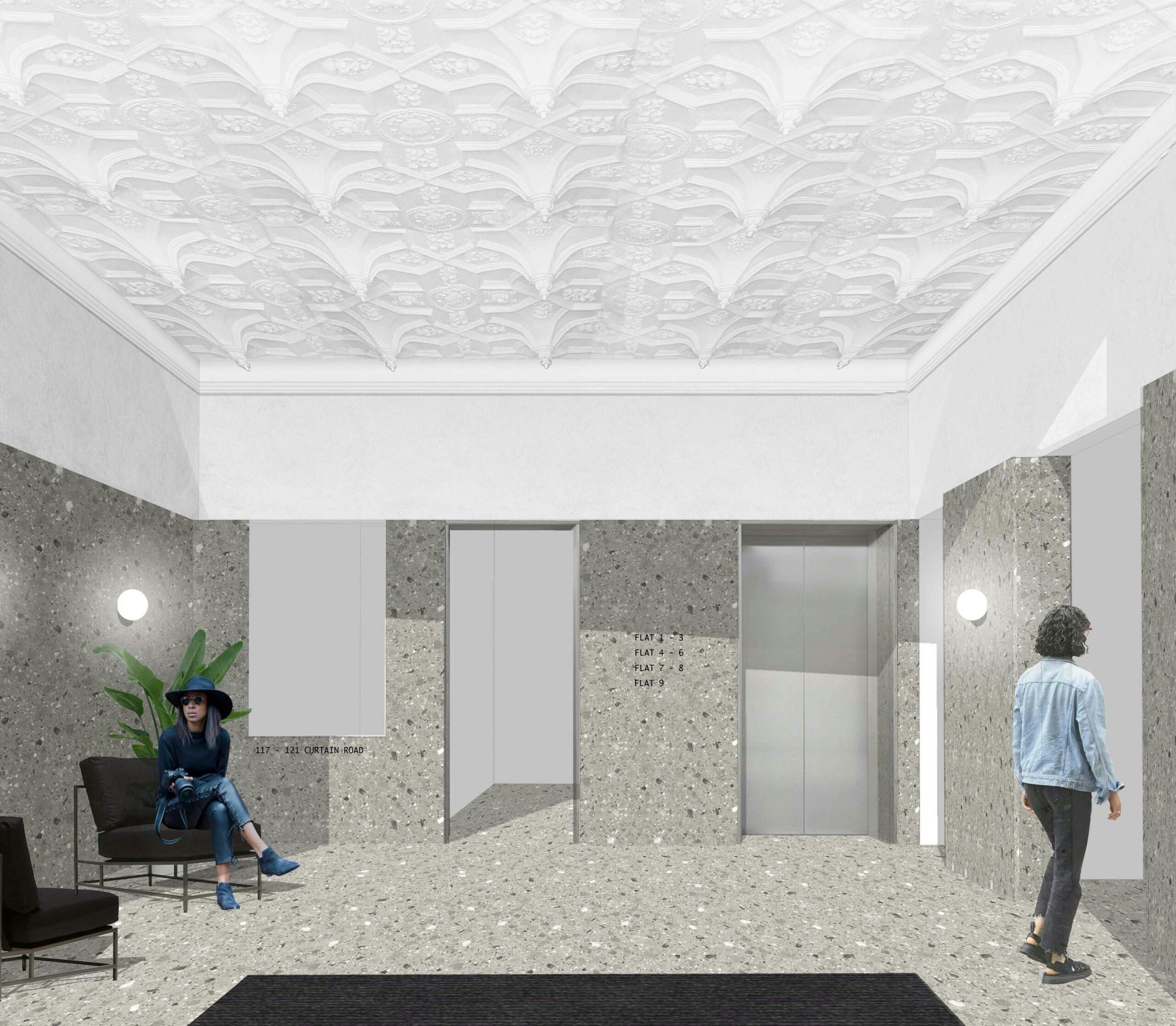 Located in the heart of the South Shoreditch Conservation Area, the attractive masonry building will be re-modelled with a new staircase and lift in the centre, simplifying circulation and creating a stack of dual aspect homes with generous natural lighting. The roof is extended and set back on the top floor to create two generous duplex homes.