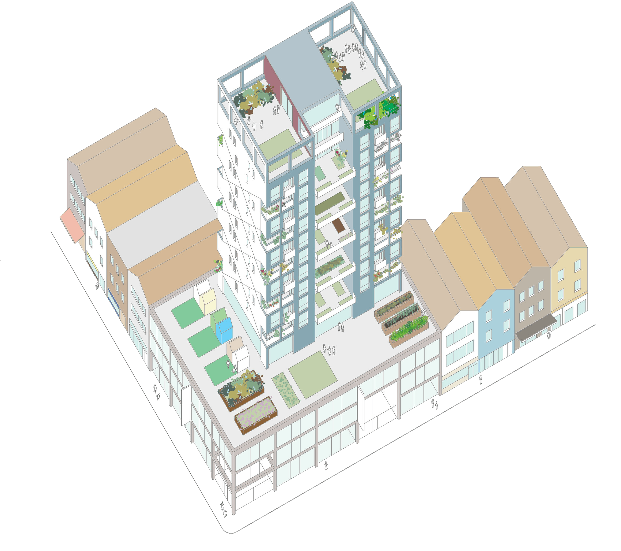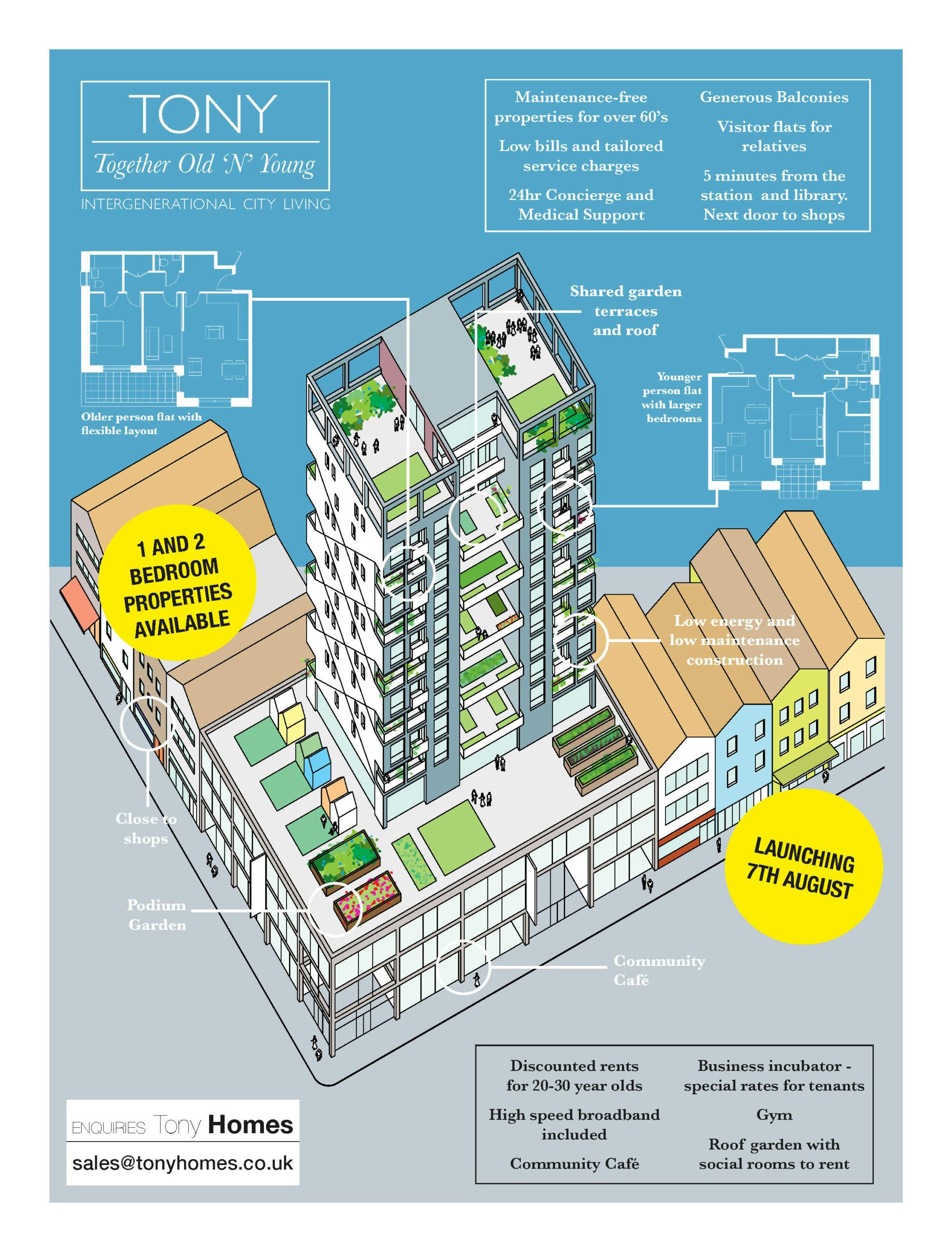 The proposal, known as ‘Tony:Together Old’N’Young,’ was shortlisted by New London Architecture (NLA) as part of their ‘New Ideas for Housing’ Competition and was exhibited at the NLA in 2015.