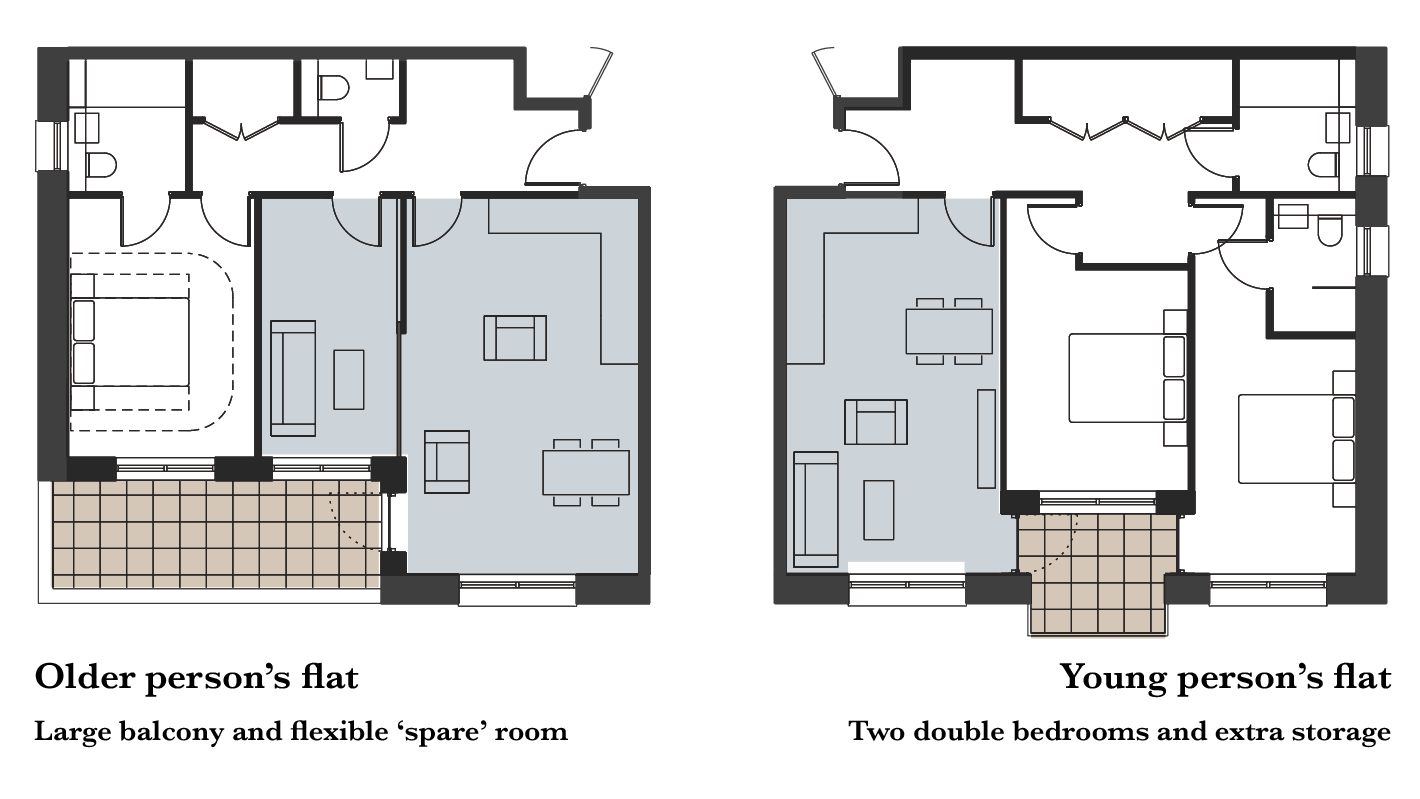 Our proposals create high-quality homes for older people in city-centre locations, close to shops, culture, transport and other services. However, rather than creating a ‘ghettoised’ old-people’s home, the mixed-use buildings would also include flats for young people with their rent subsidised by their older neighbours. At street level, the buildings would incorporate incubator space for new businesses with older residents providing mentoring and business insight. Flats would be designed to suit the needs of their residents with those for older people incorporating flexible spare rooms and large balcony spaces. Guest flats would be made available for families to stay while visiting their relatives, and large roof-top gardens, balconies and social spaces would provide space for formal and informal activities.