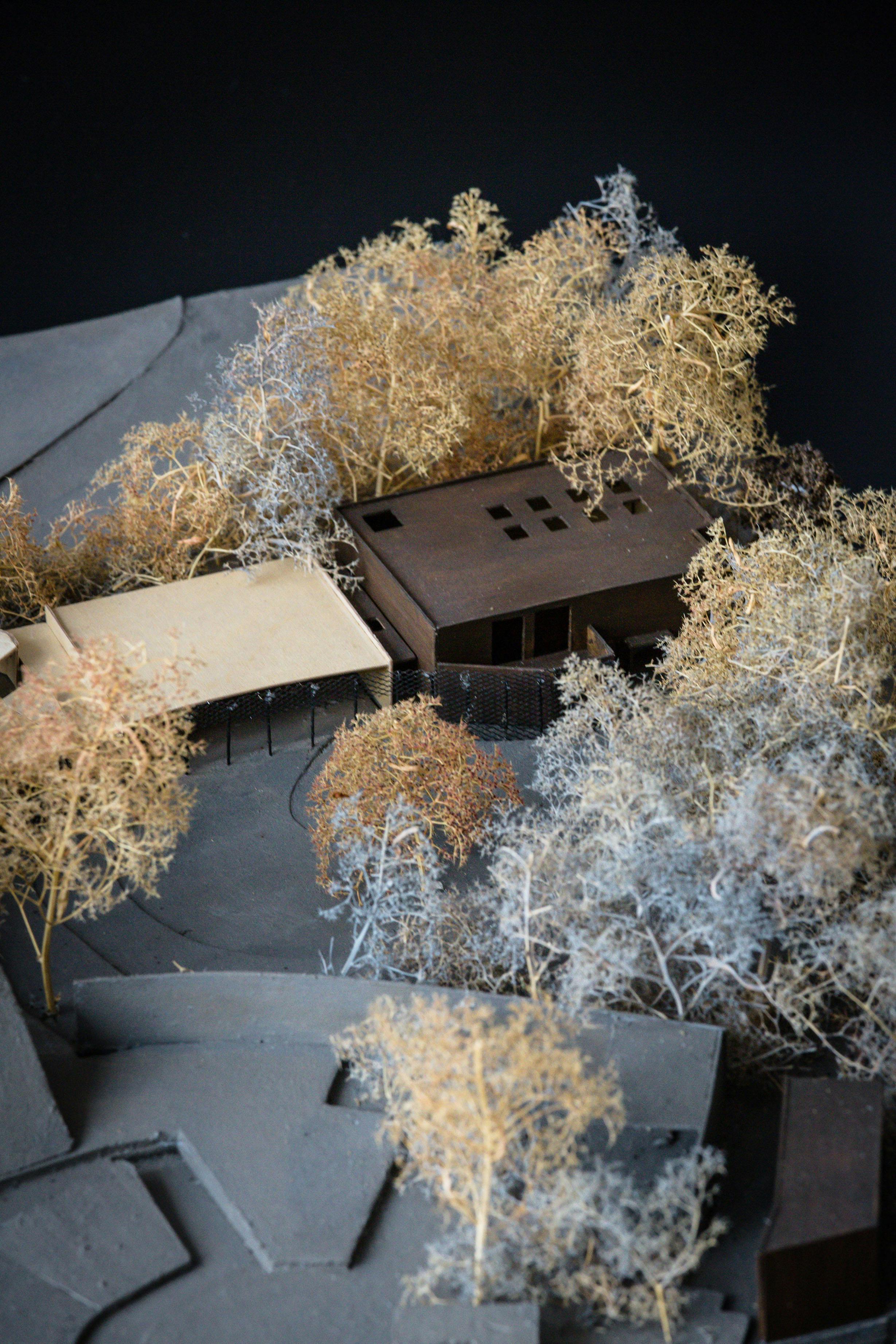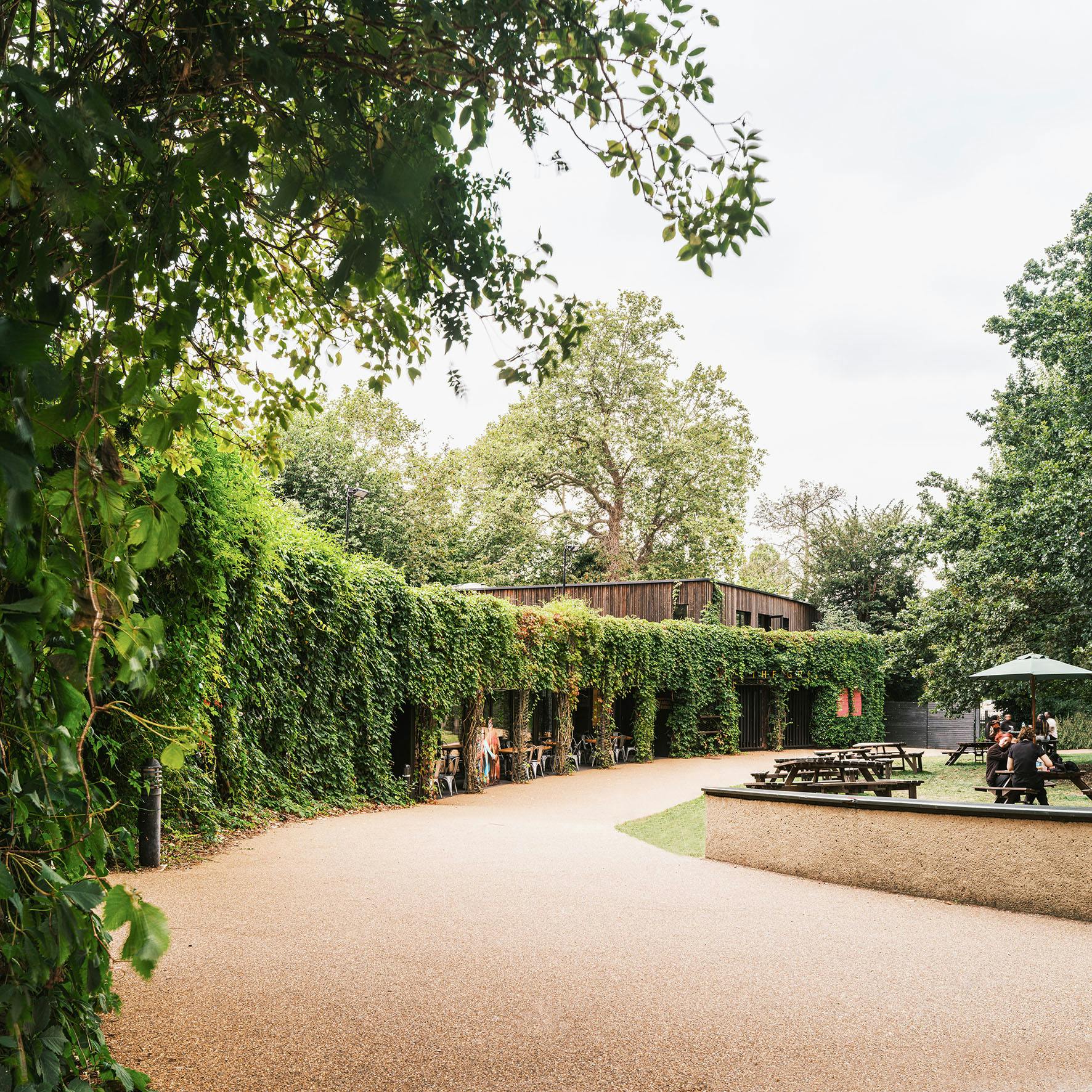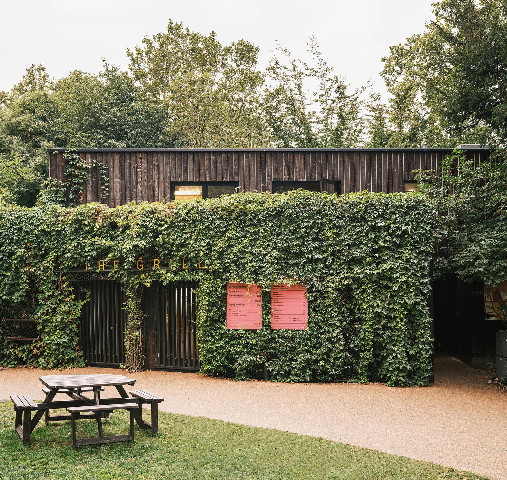 The buildings are clad in a band of dark stained larch at the base, with a crown of textured cladding above. The details were developed to reinforce the magic of the setting in which the trees, plants and sky surround the visitor. They help to blur the distinction between building and landscape while creating a natural extension to the existing buildings along the edge of the site.