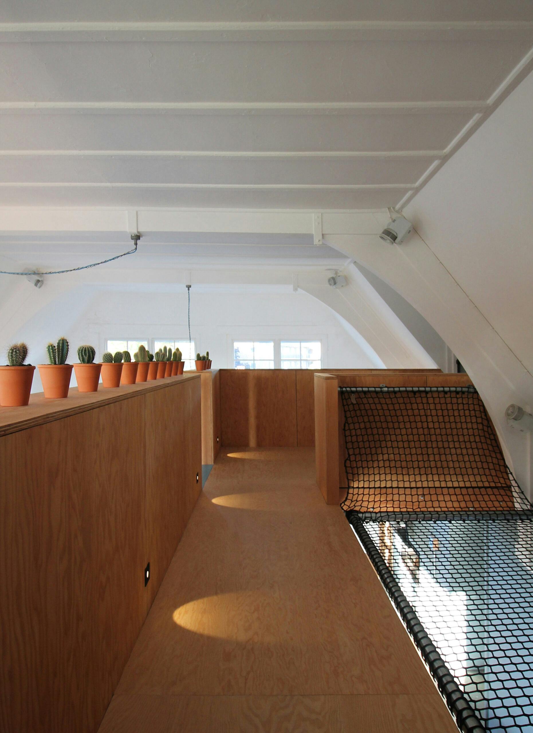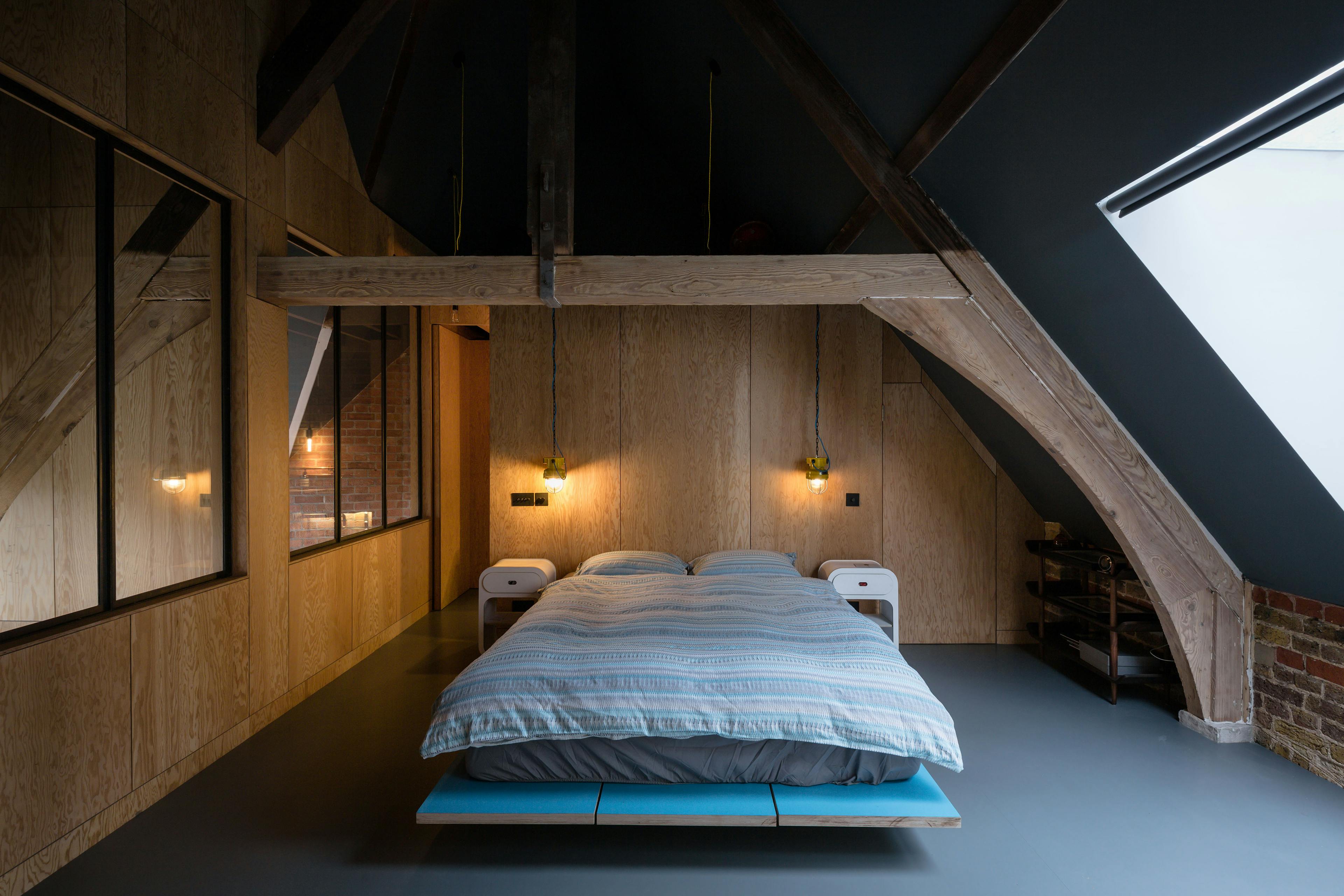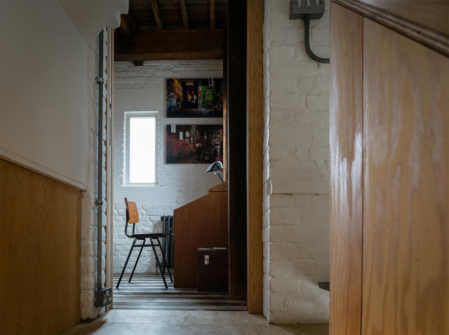 A pair of modern spiral staircases in the living space have been replaced with a new metal and timber stair leading to a plywood walkway. The walkway, supported on douglas fir flitch beams, connect the existing mezzanine level with the bell tower allowing it to be converted to a small guest bedroom. A new family bathroom has been created under the mezzanine and new plywood screens introduced to create a third bedroom. New en-suite bathroom and WC pods have also installed in the mezzanine and bell tower without compromising the existing roof structures. Each of the new partitions has been conceived as a piece of furniture and has been constructed using a warm douglas fir plywood with built-in storage for the owners’ collections from their travels.