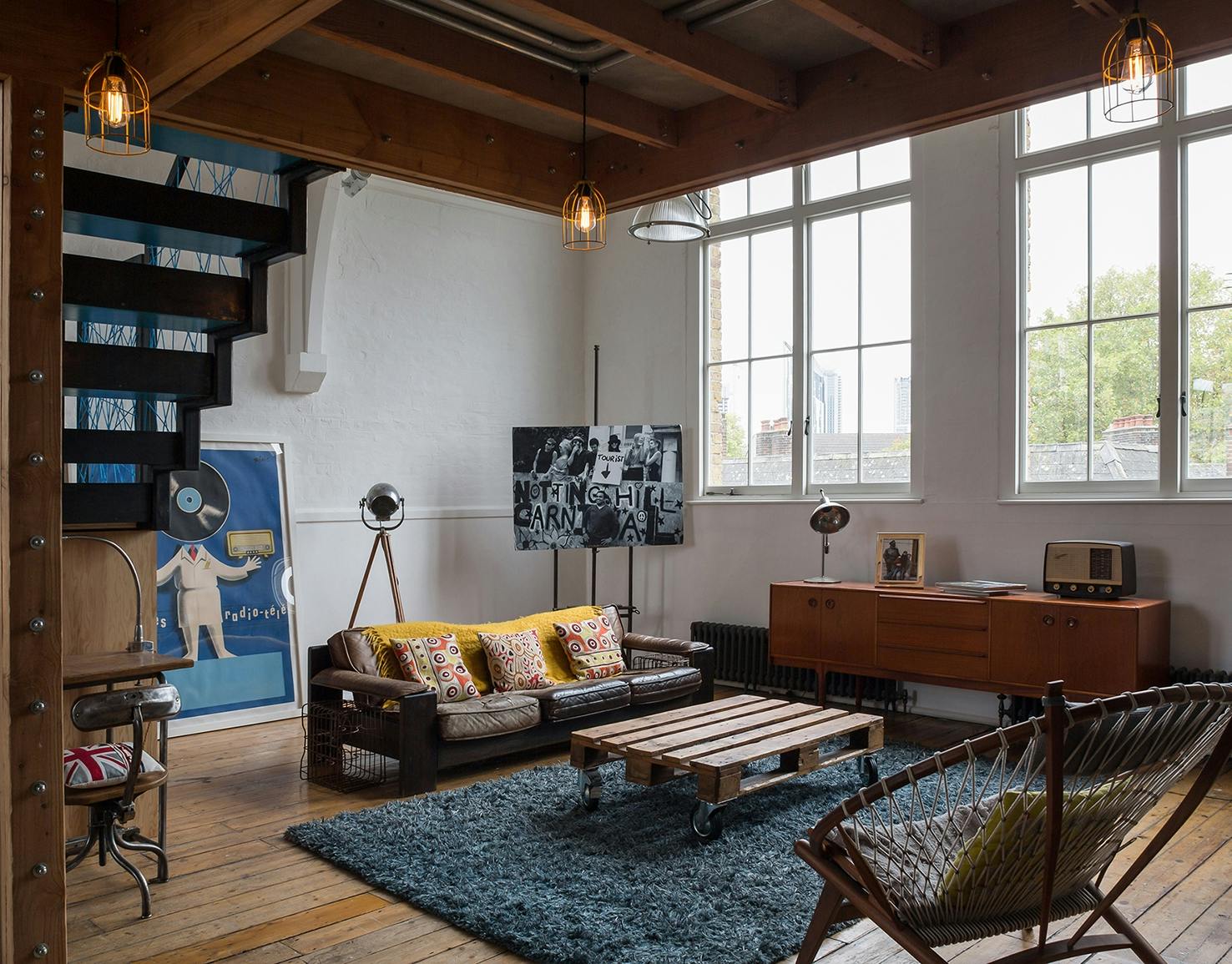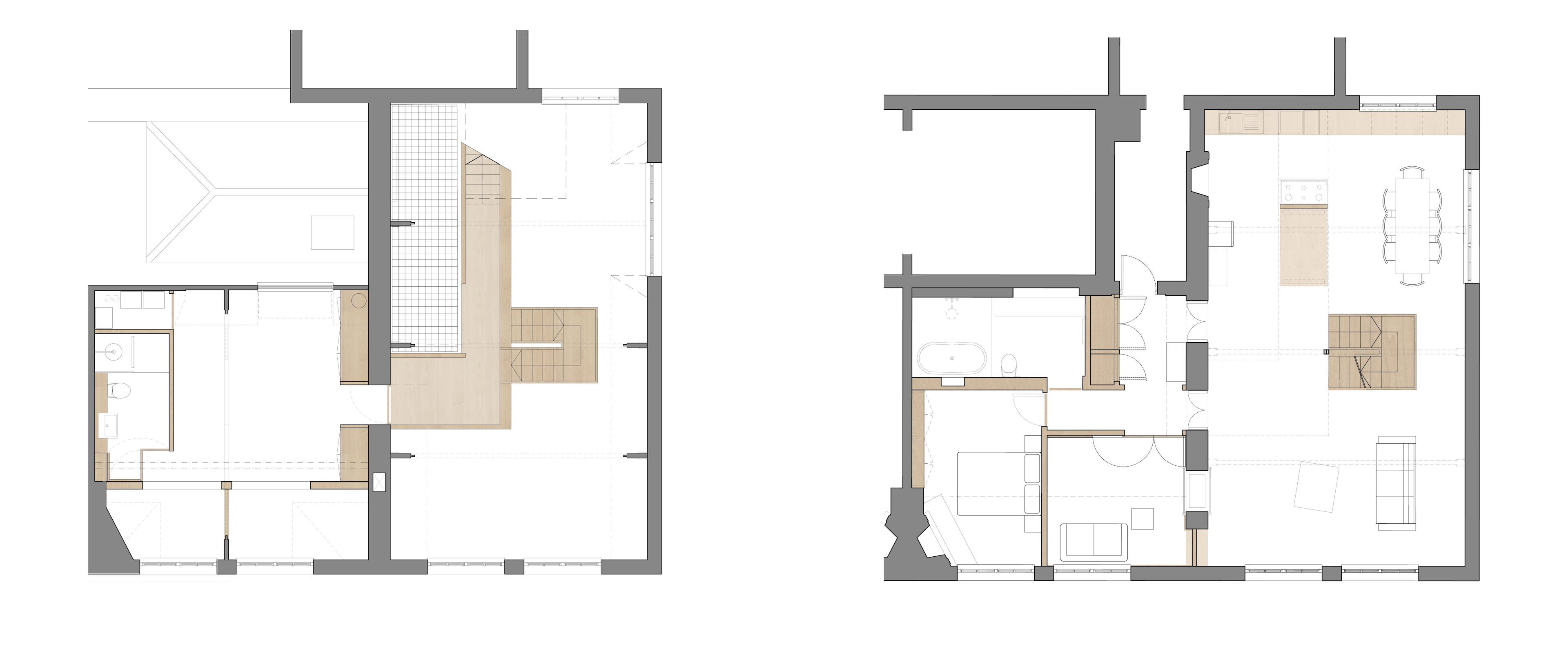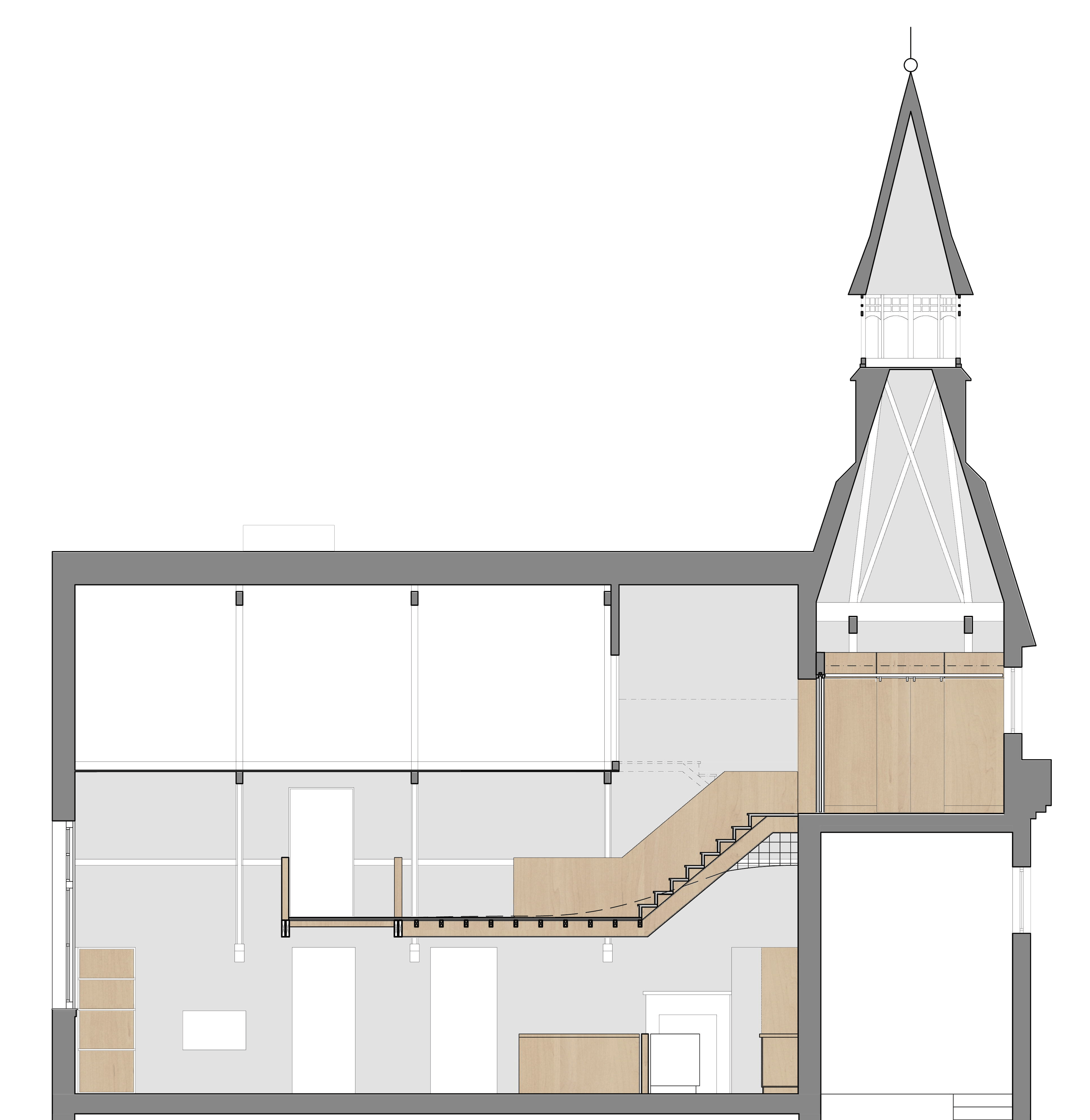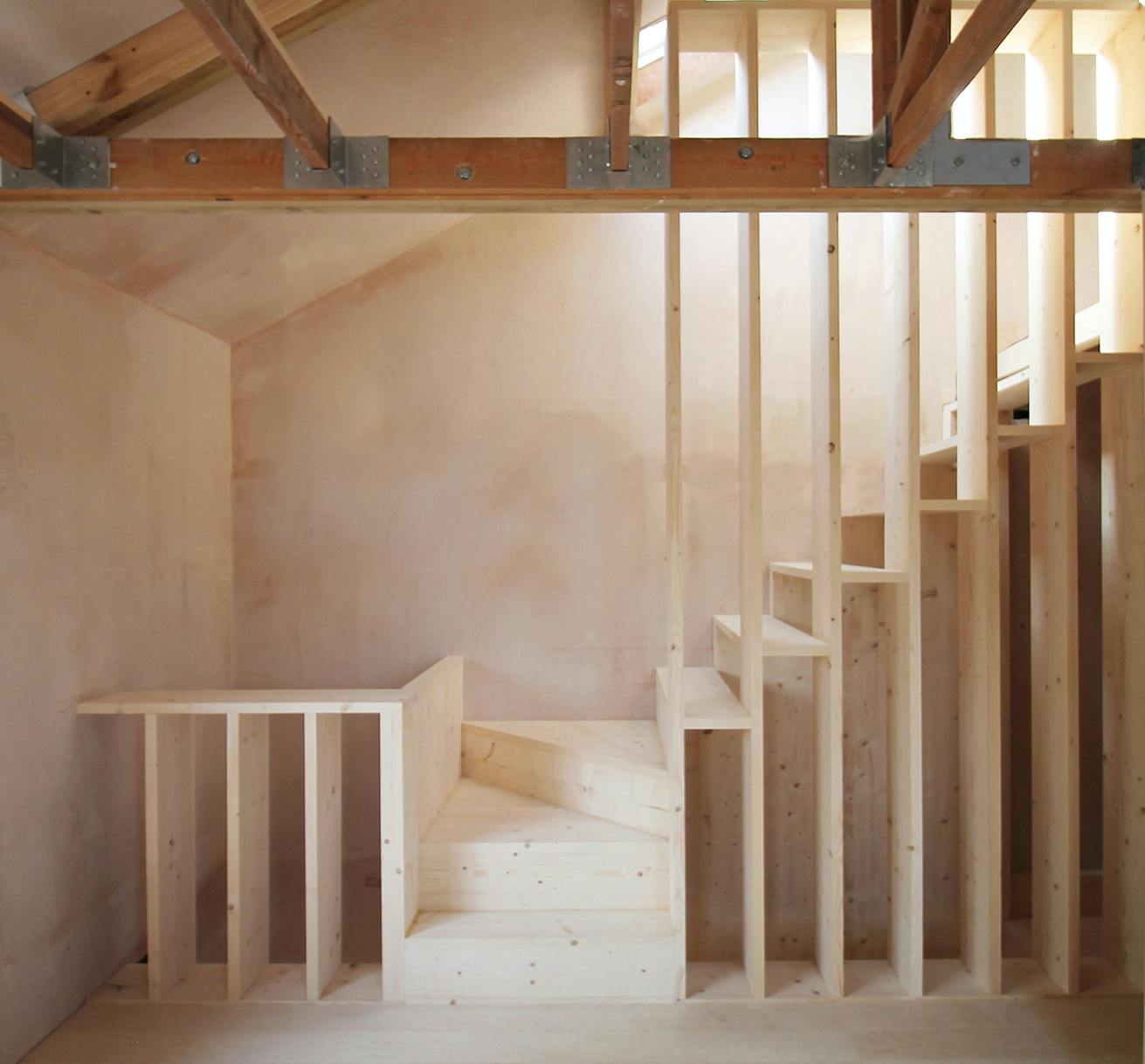 A pair of modern spiral staircases in the living space have been replaced with a new metal and timber stair leading to a plywood walkway. The walkway, supported on douglas fir flitch beams, connect the existing mezzanine level with the bell tower allowing it to be converted to a small guest bedroom. A new family bathroom has been created under the mezzanine and new plywood screens introduced to create a third bedroom. New en-suite bathroom and WC pods have also installed in the mezzanine and bell tower without compromising the existing roof structures. Each of the new partitions has been conceived as a piece of furniture and has been constructed using a warm douglas fir plywood with built-in storage for the owners’ collections from their travels.