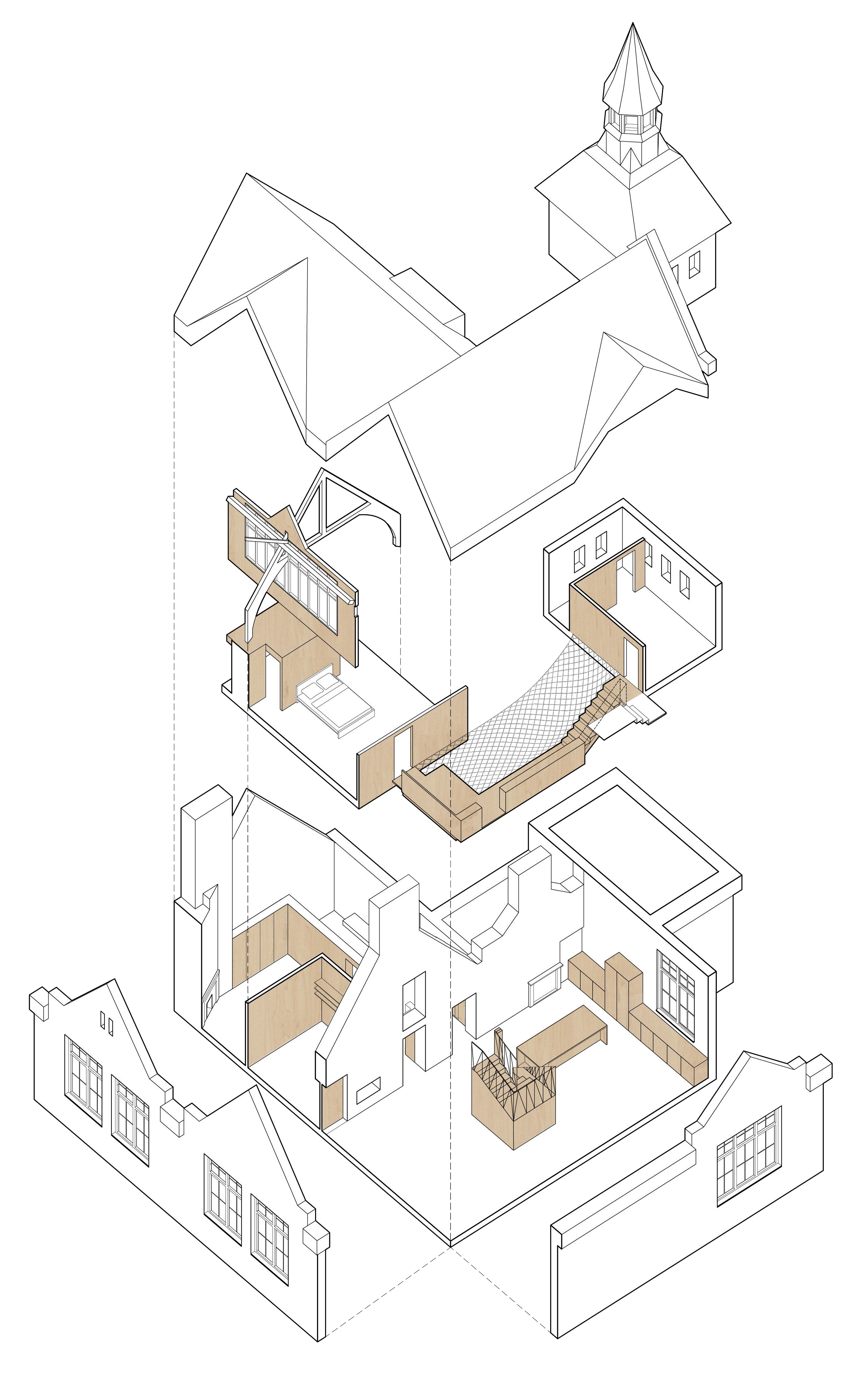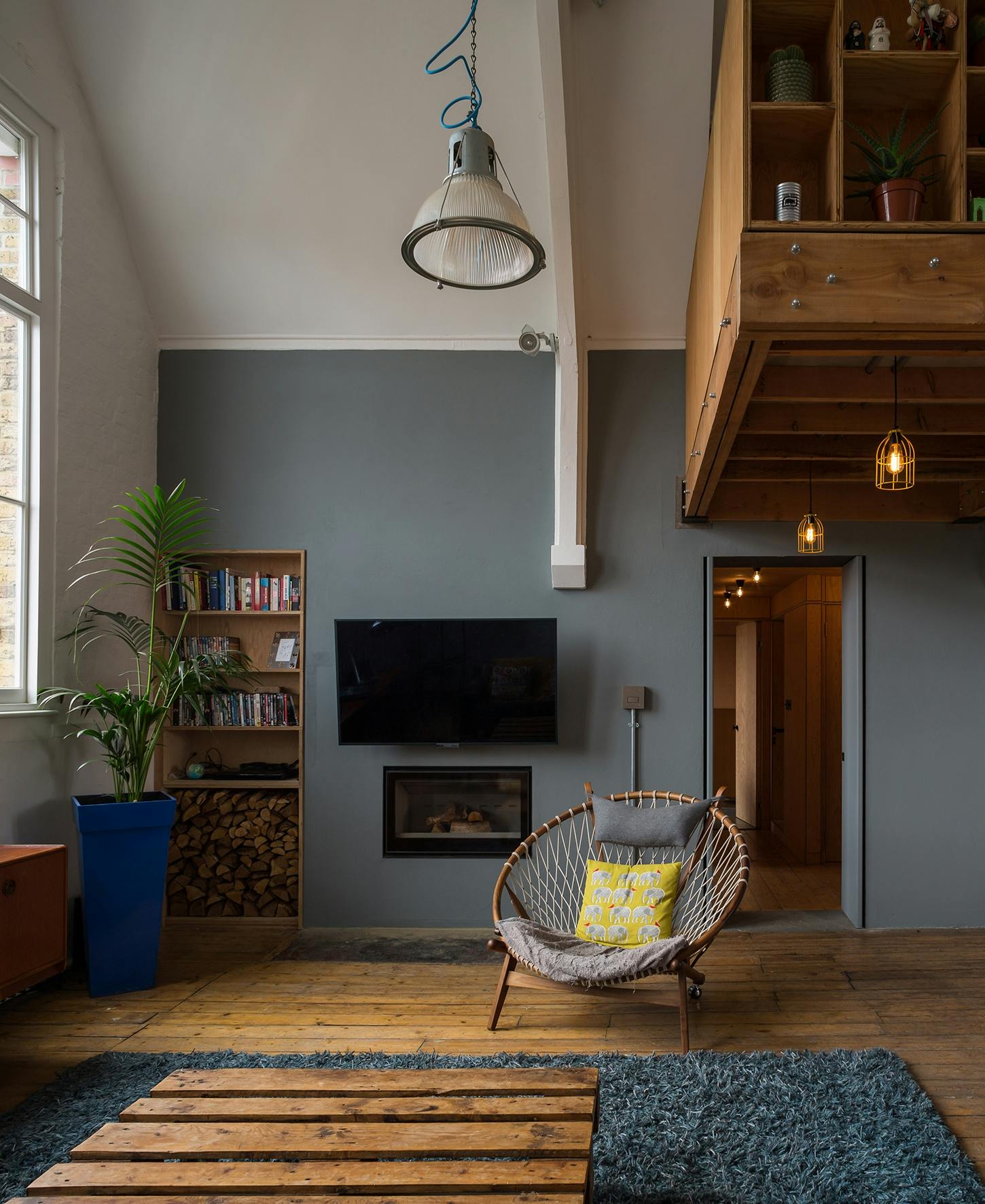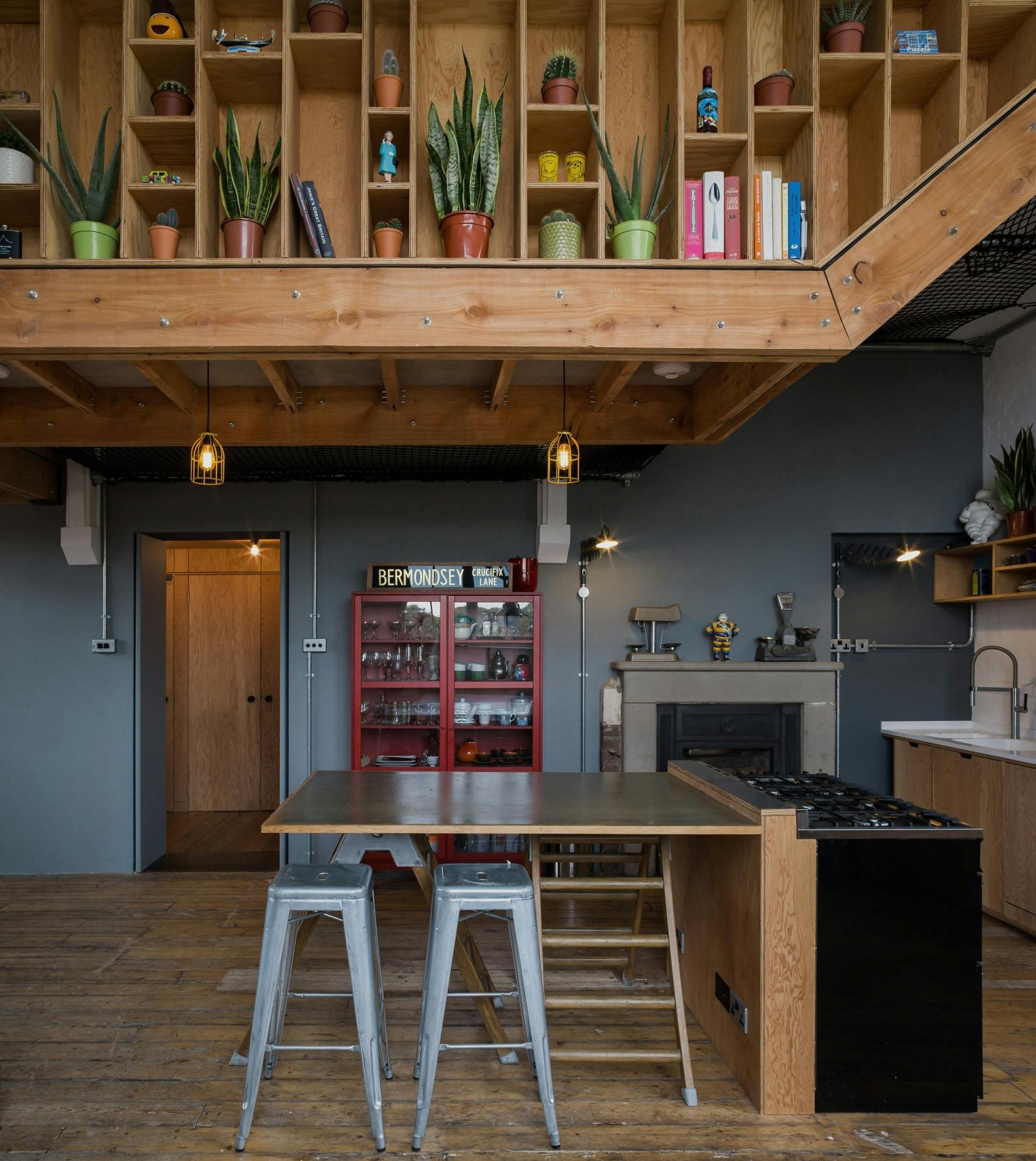 This refurbishment project introduces a number of plywood structures into one of London’s oldest School Board buildings. This Grade II listed building was originally converted to apartments in the 1990’s. We were commissioned to look at how to make better use of the two large, double-height spaces (the former classrooms) and the dramatic bell tower structure. Other than a pair of beautiful fire places and roof structures, there were very few original features in property, so it was important for us and the client to make the most of what remains.