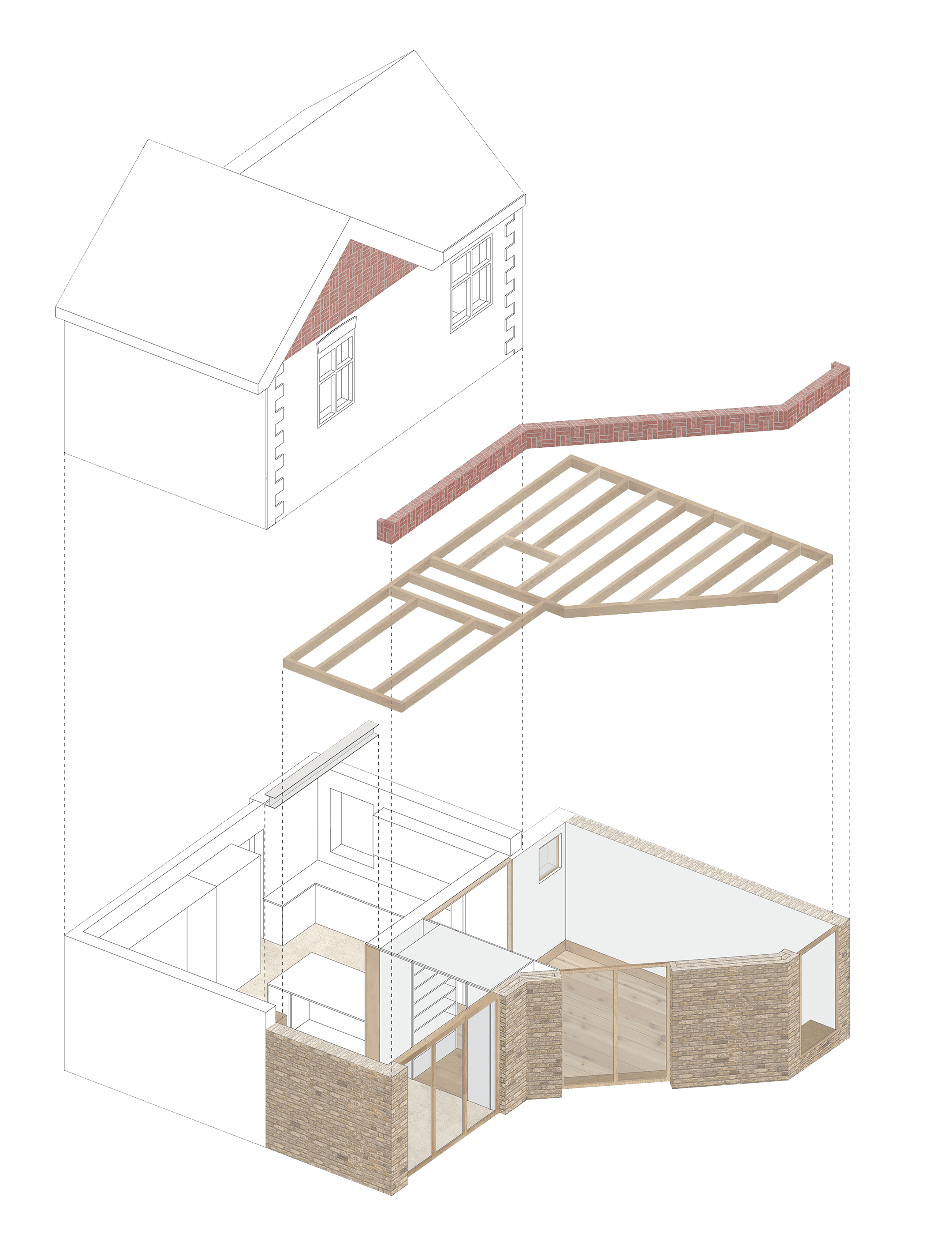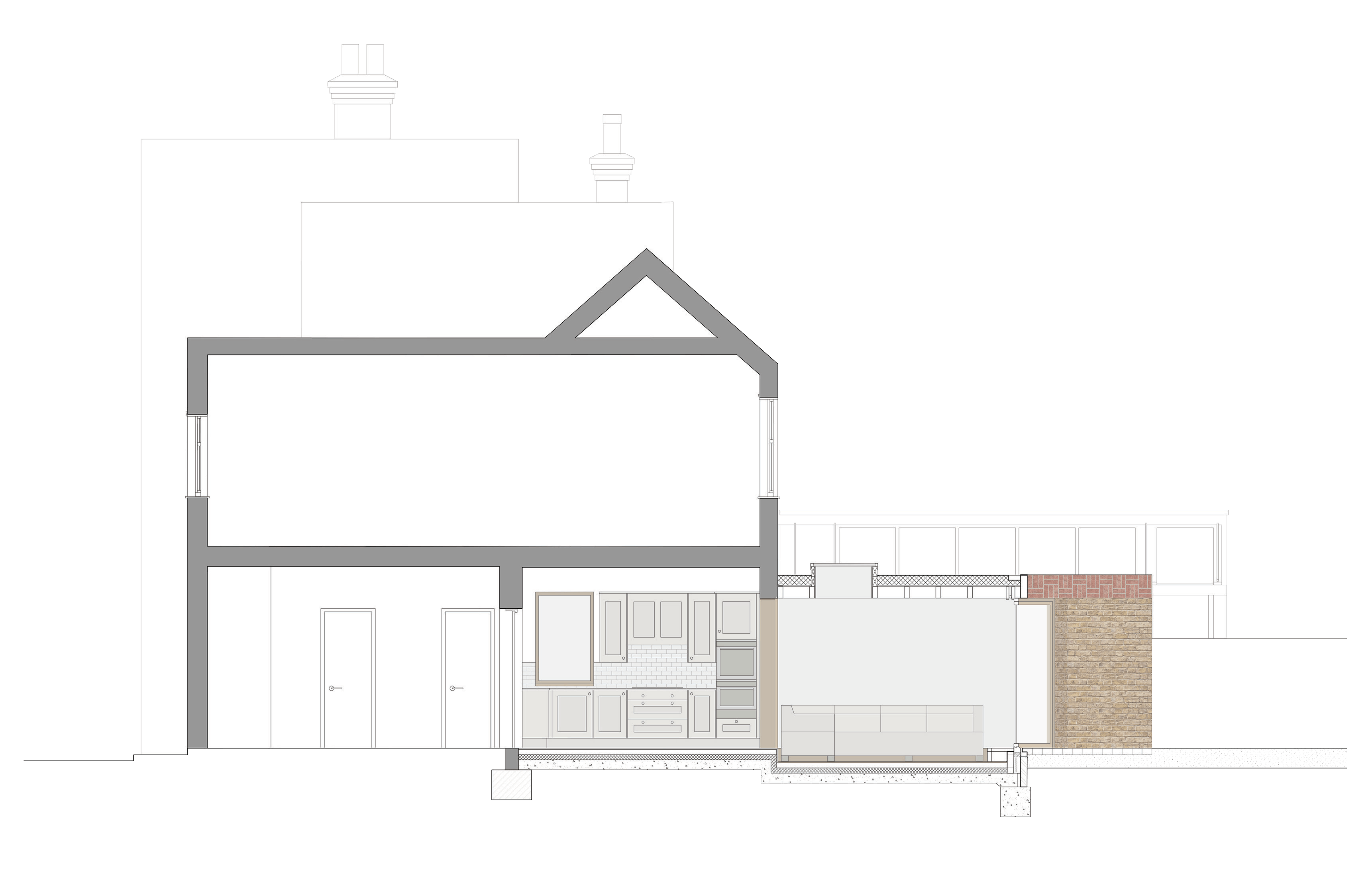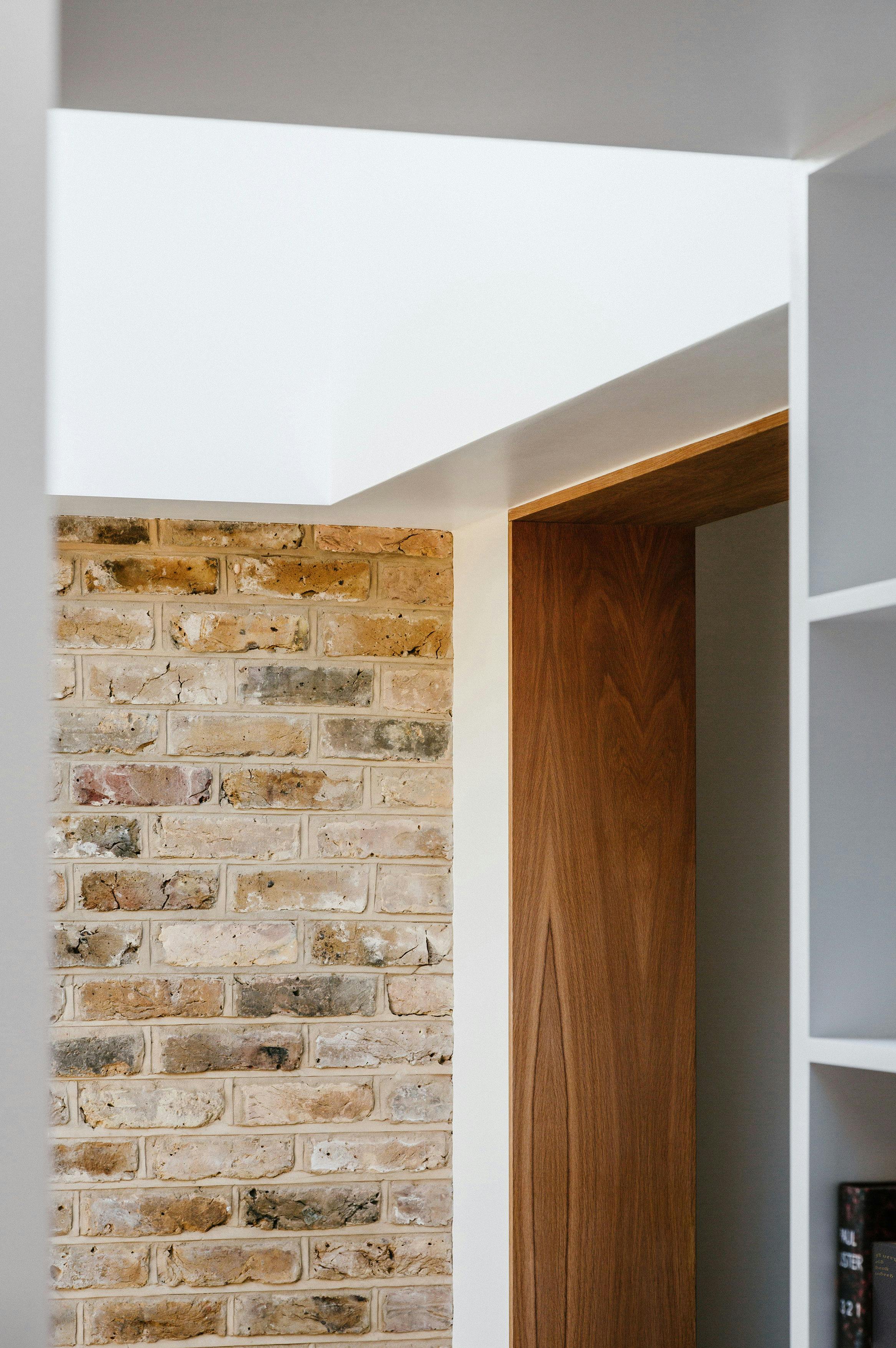 The use of second hand London stock brickwork as the predominant building material gives the architecture a physical consistency and provides coherence with the existing house. The red brick basketweave parapet references the material of the past without replicating it by interlocking the bricks rather than using the original stack bond pattern. The parapet is topped with salvaged red tiles from the original extension.