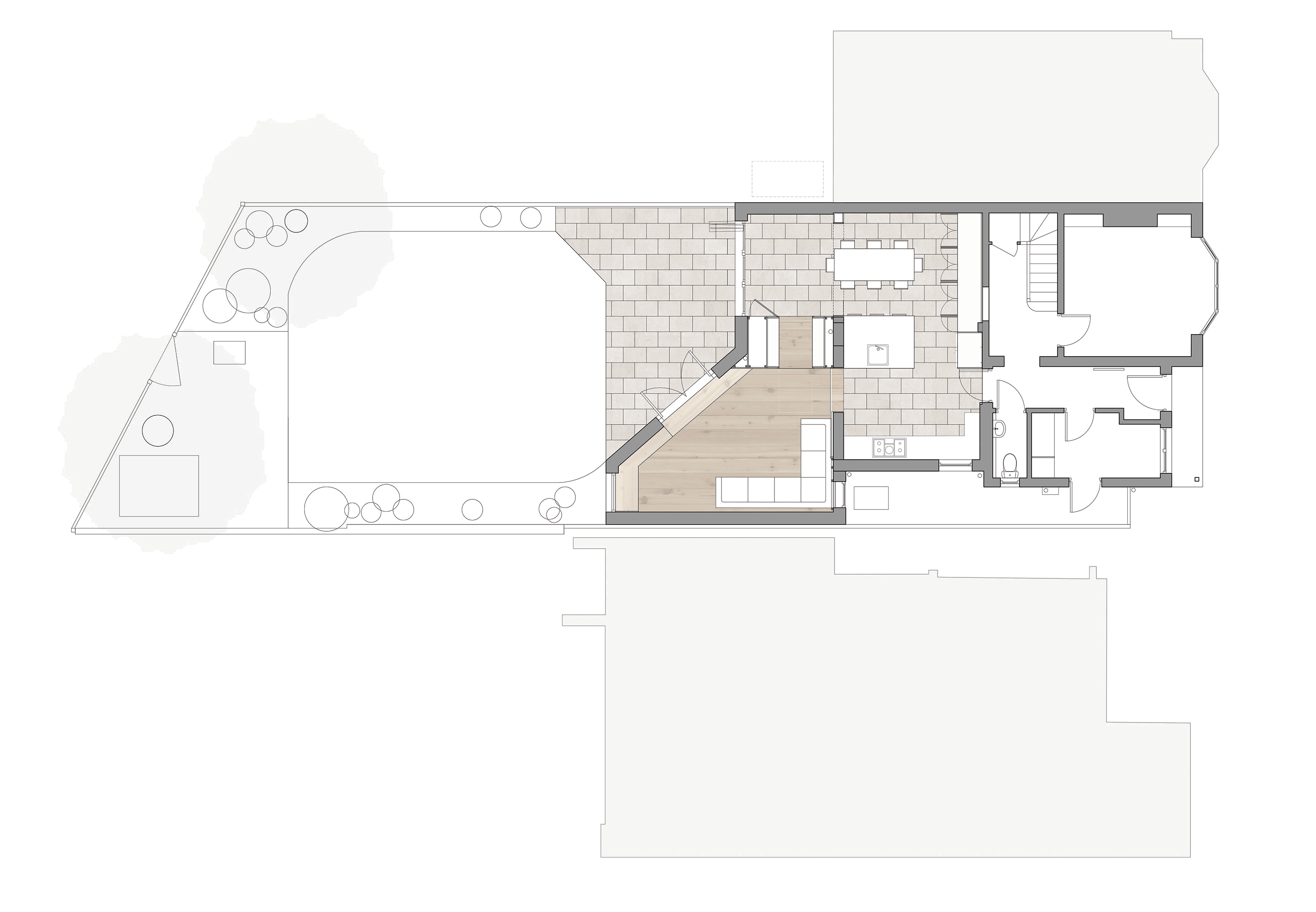 With a north-facing garden, we wanted to create a new structure that would be light and open. The wedge-shaped plan allowed us to create a small sun trap where the garden receives the most sunlight.