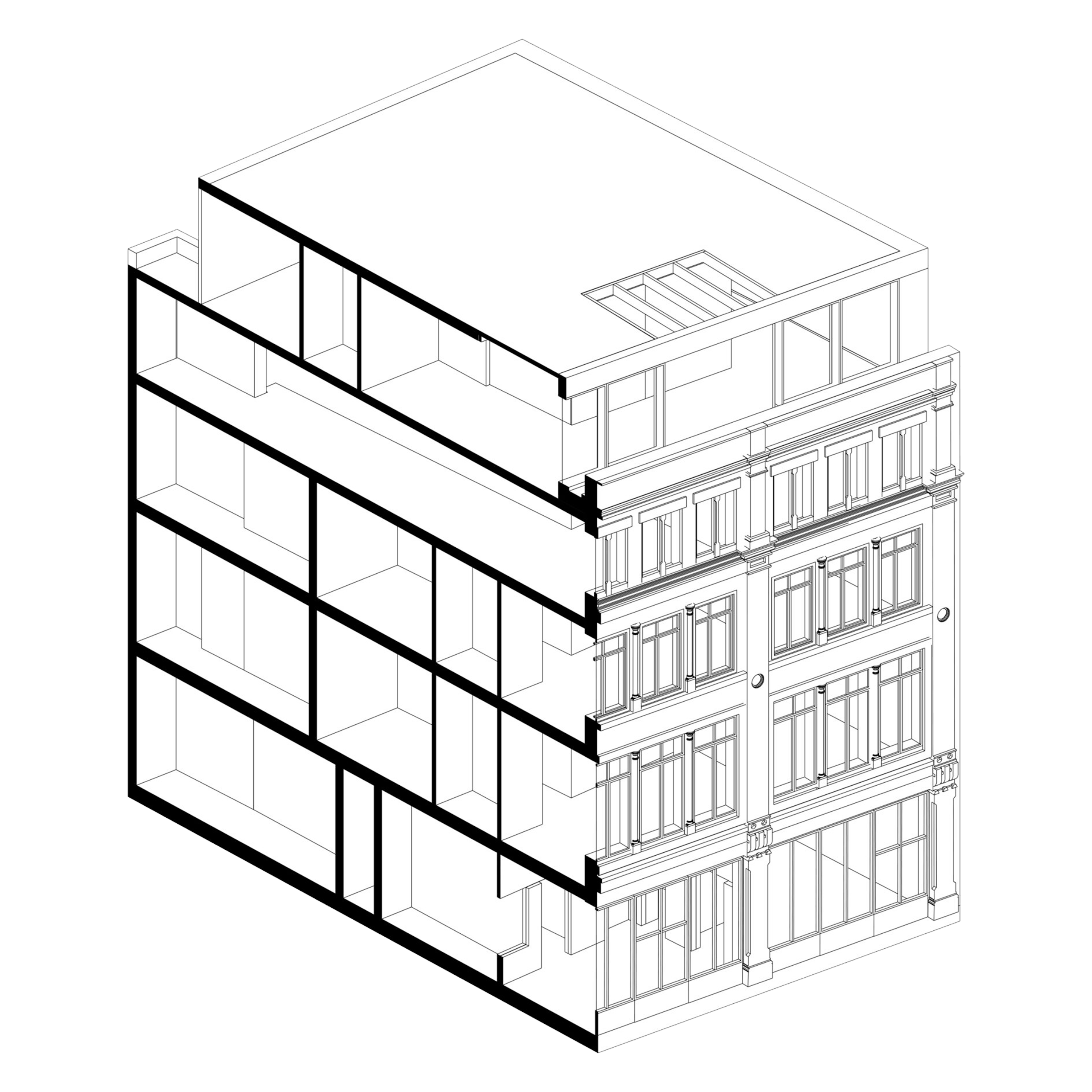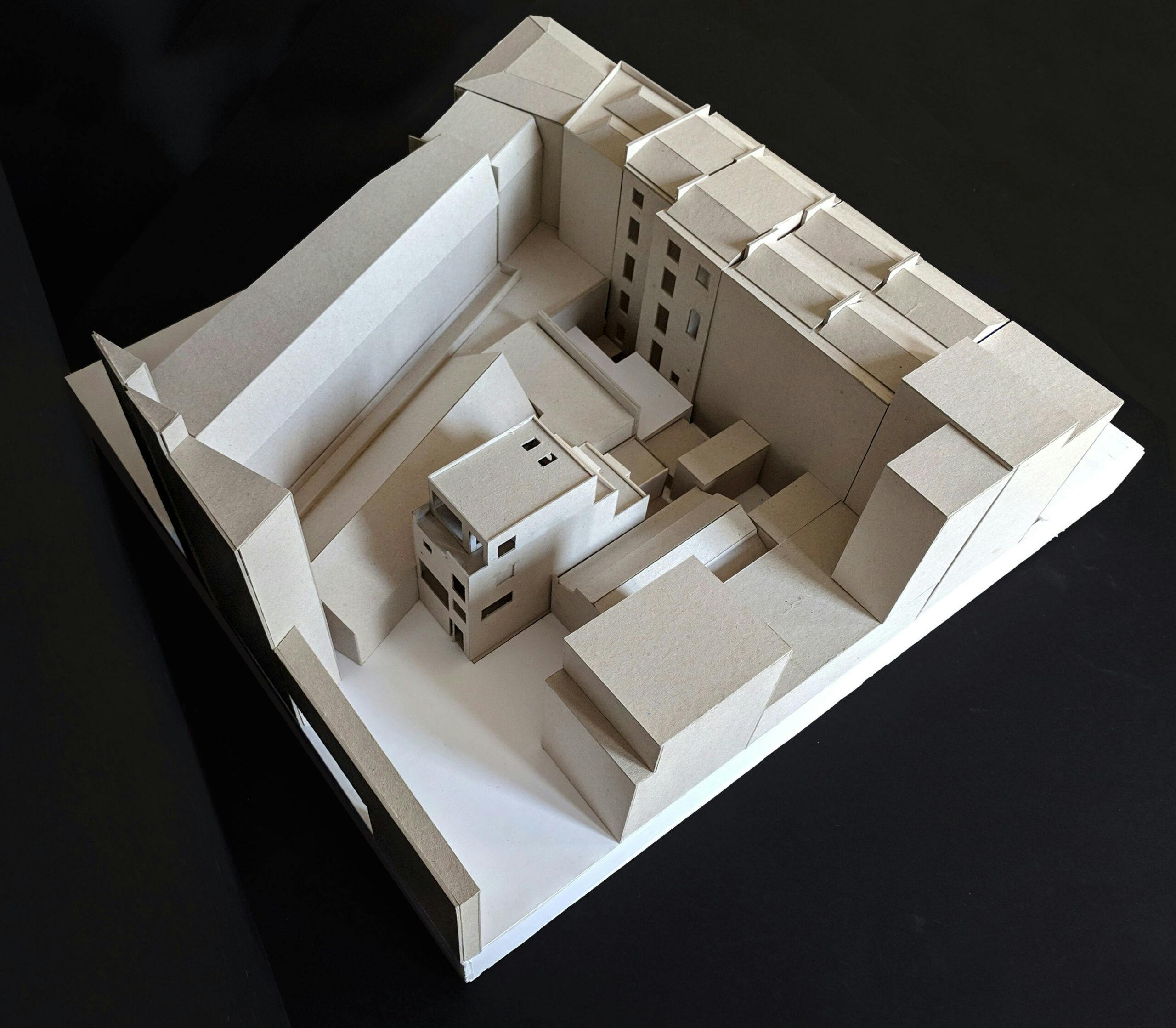 This small block of three flats forms part of a mixed-use development on Blackfriars Road. With two one-bedroom flats and a two-bedroom duplex unit above, the design responds to the tight urban site with stock brick façade to the street and sculpted, timber façade to the rear.