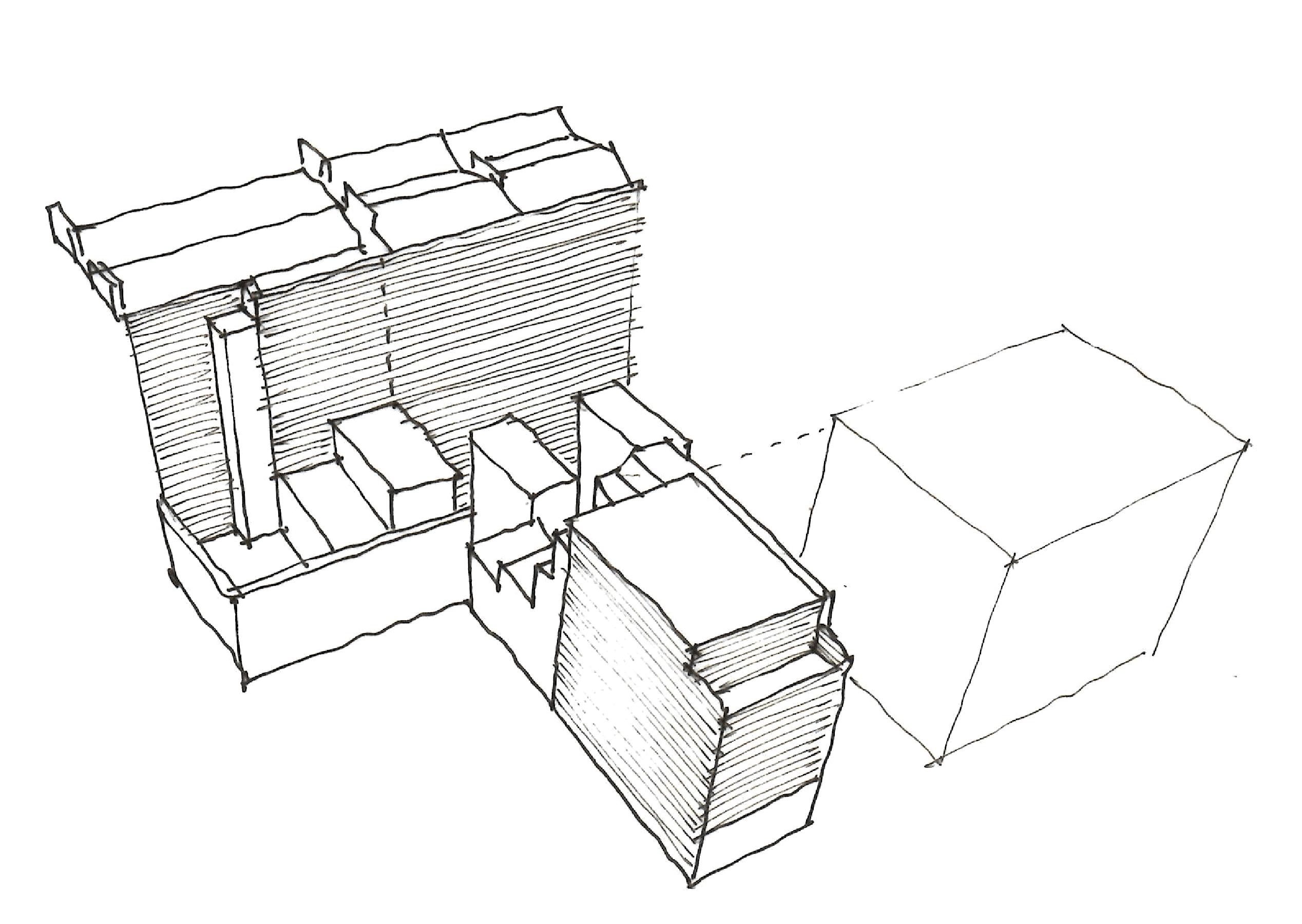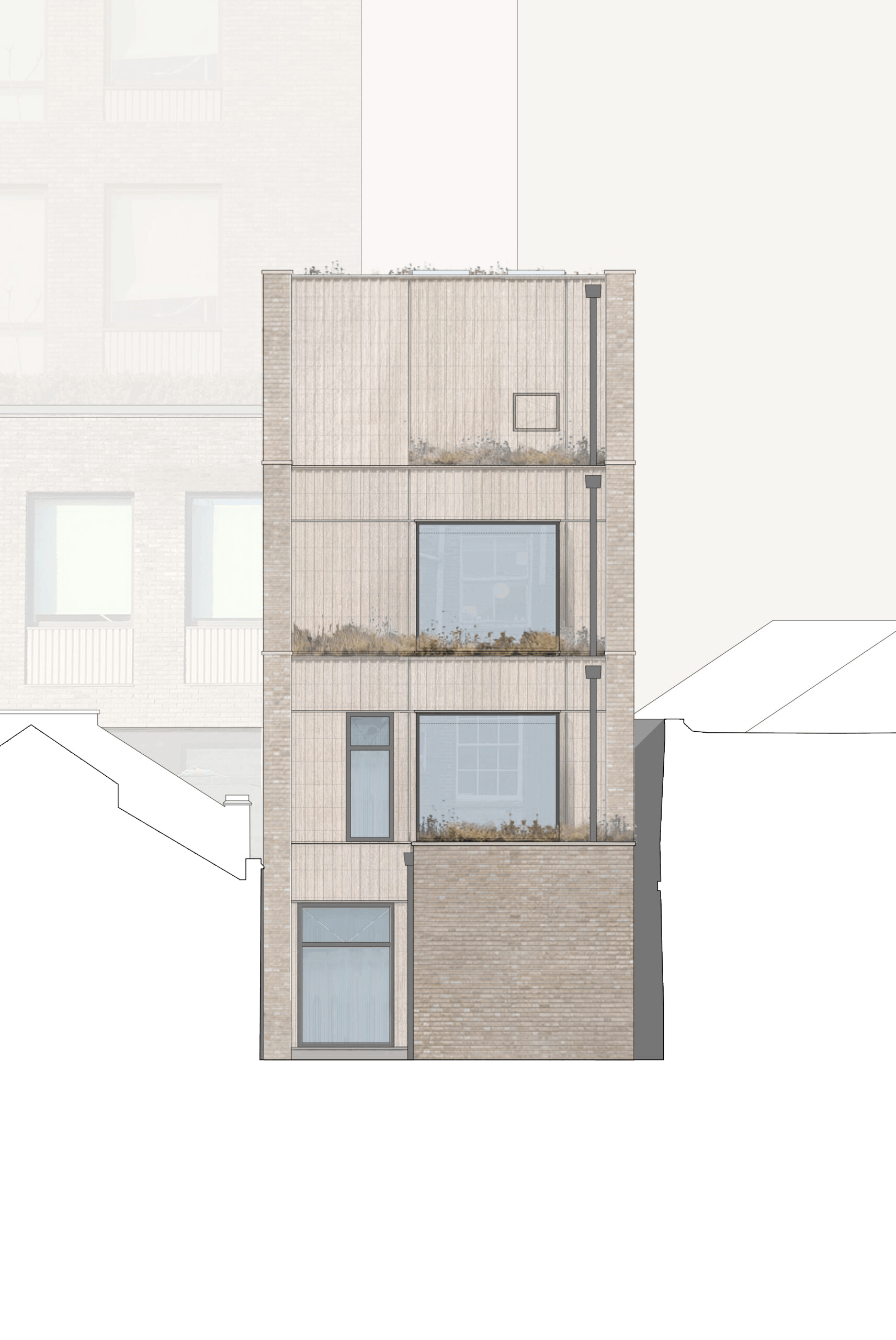 The rear of the building steps to maintain daylight levels to neighbouring properties. The resulting flat roofs are to be planted to create habitat for wildlife and to improve the microclimate. The use of timber on this façade reflects the more private nature of the space and helps to soften it – improving acoustics.