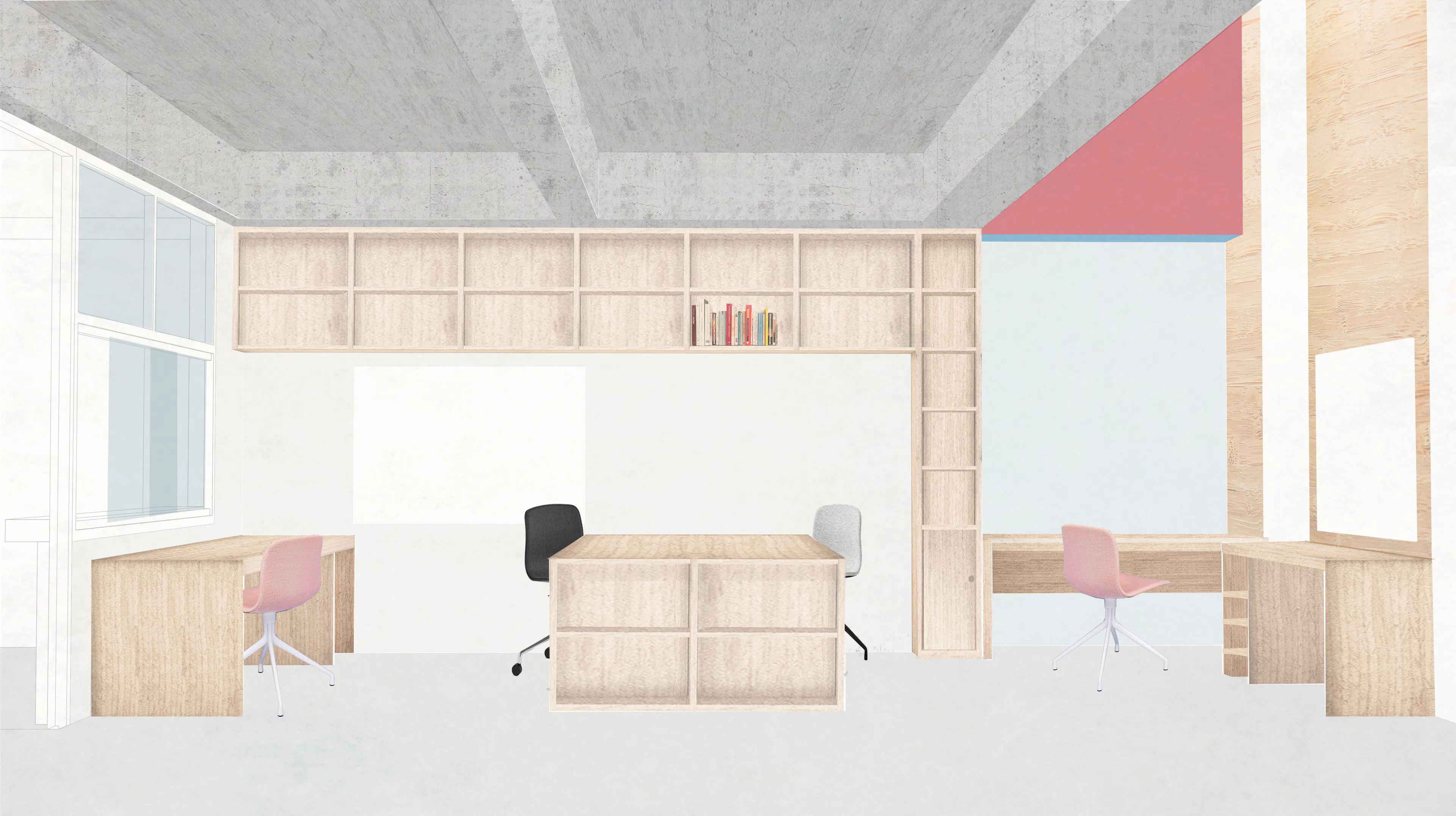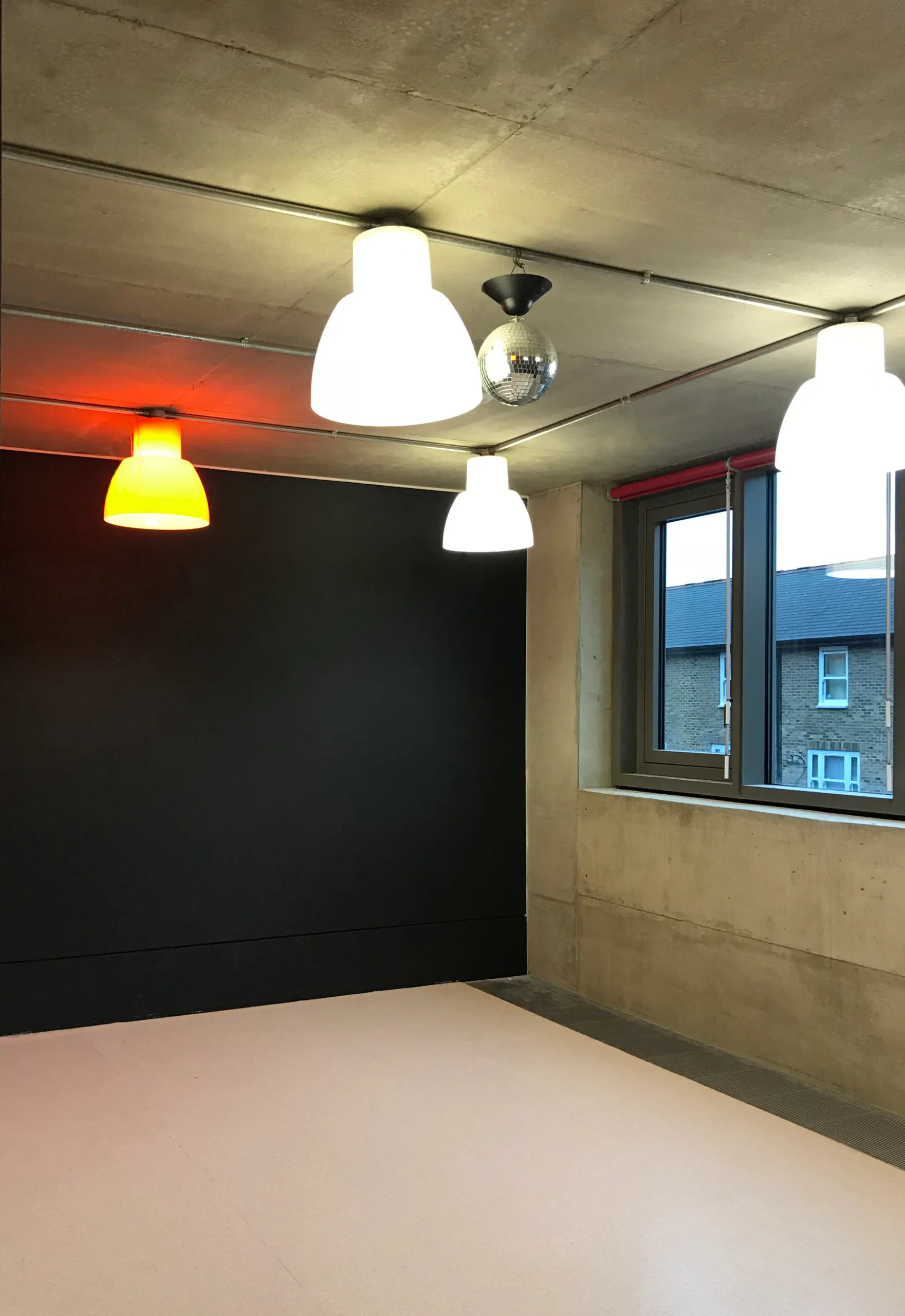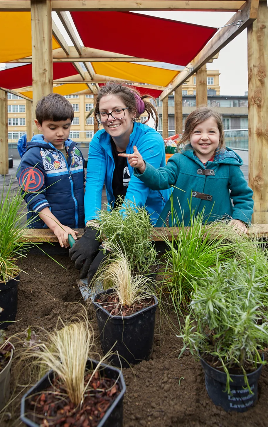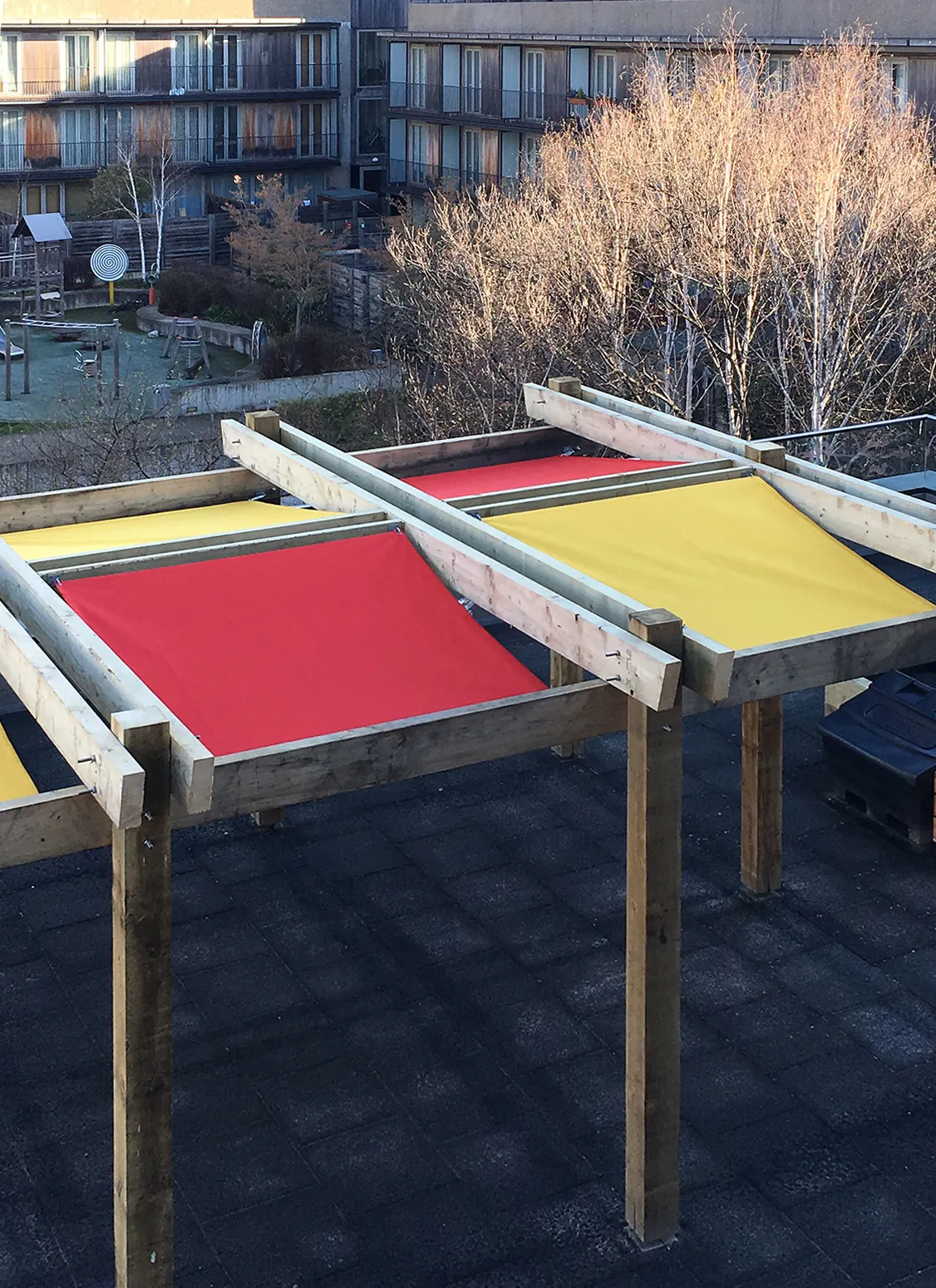 Work included the creation of a brand new kitchen within the nursery and a series of shading structures and planters on the terrace.  The fabric sun shades in red and yellow took inspiration from Haworth Tompkins Architect’s façade.