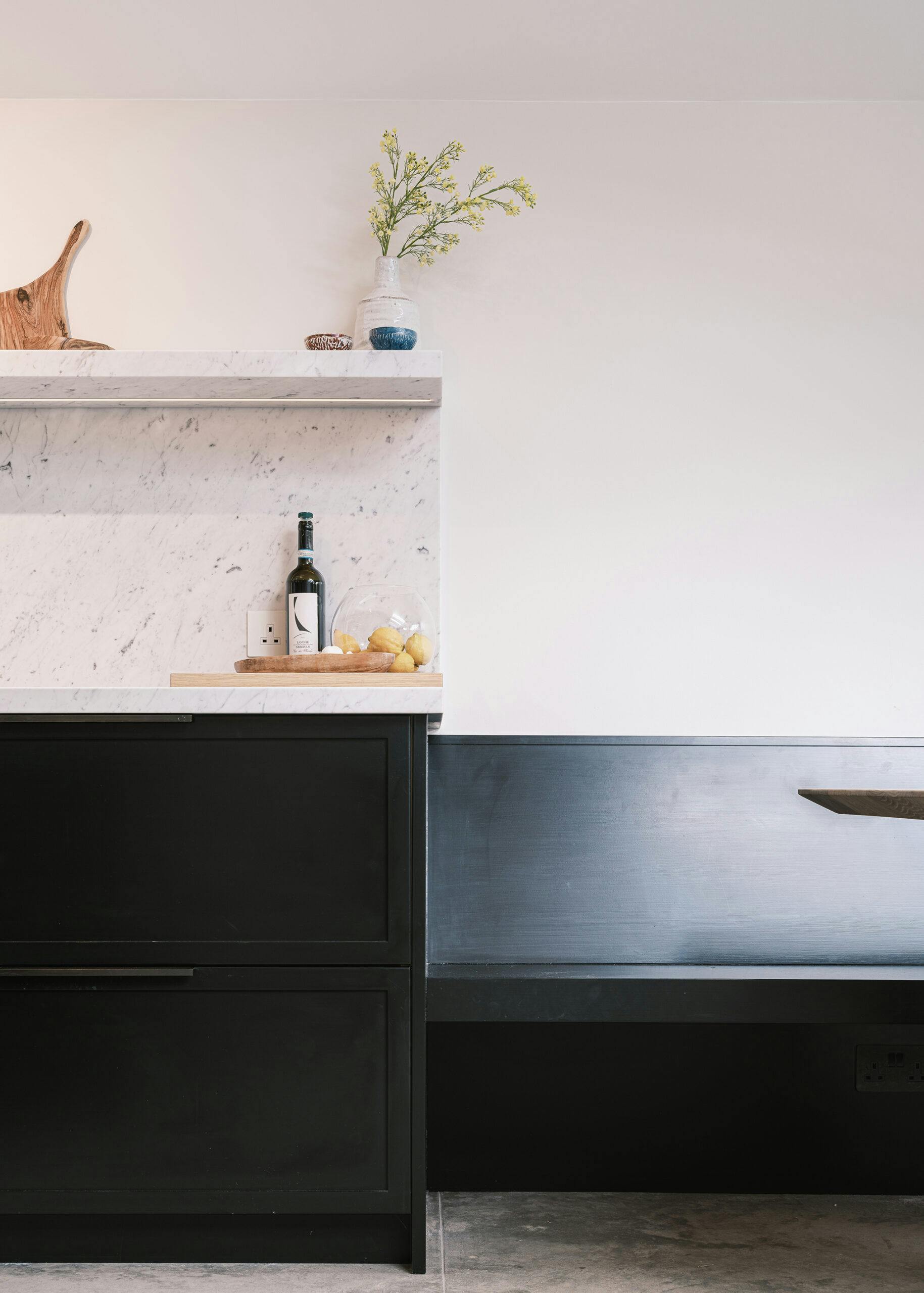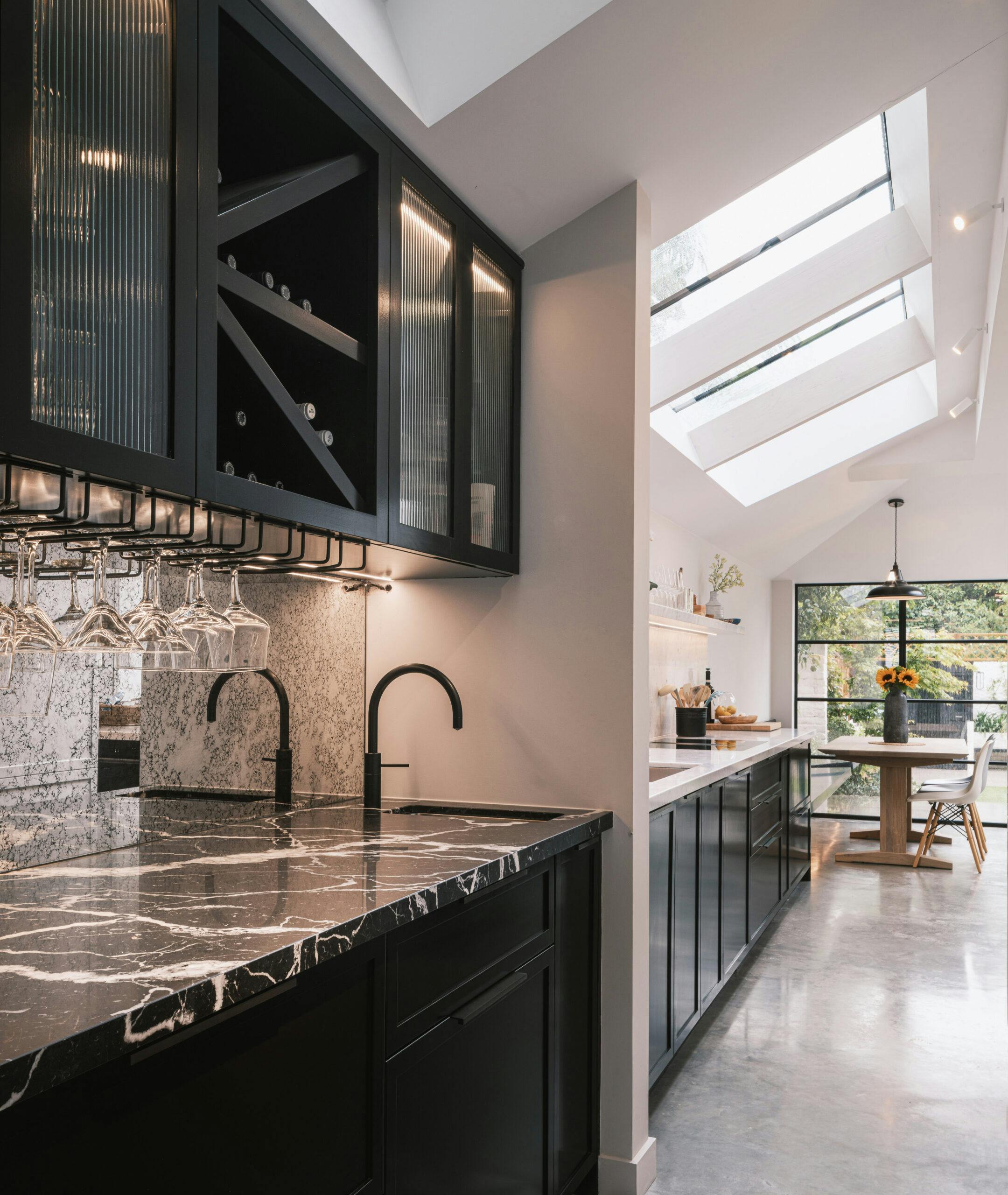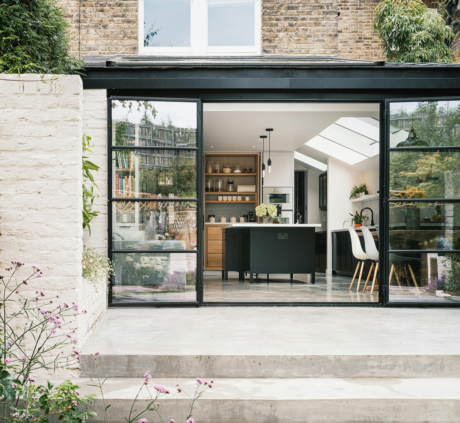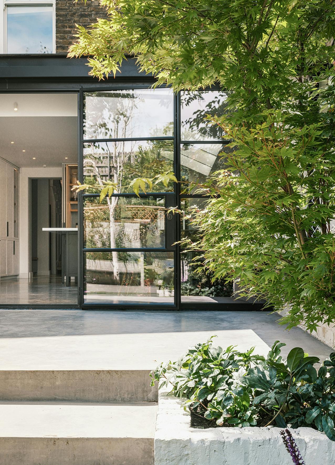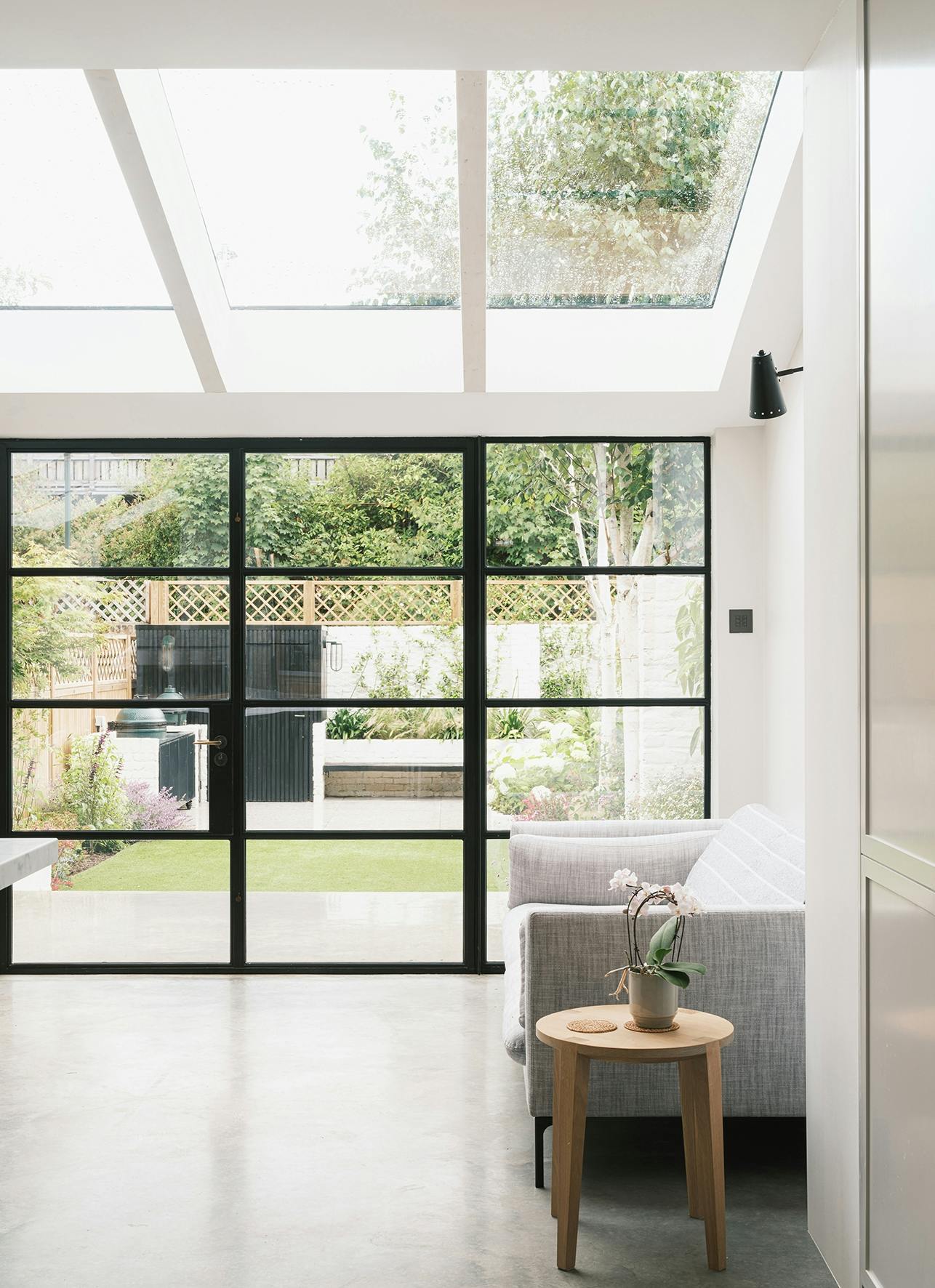 The formal living space at the front of the house is linked to the kitchen via a small bar, located in the old lightwell. The kitchen/dining space, bathed in natural light, is characterised by a monochrome palette, with a concrete floor and white washed walls which extend out into the refurbished garden, culminating into an outdoor kitchen and seating area.