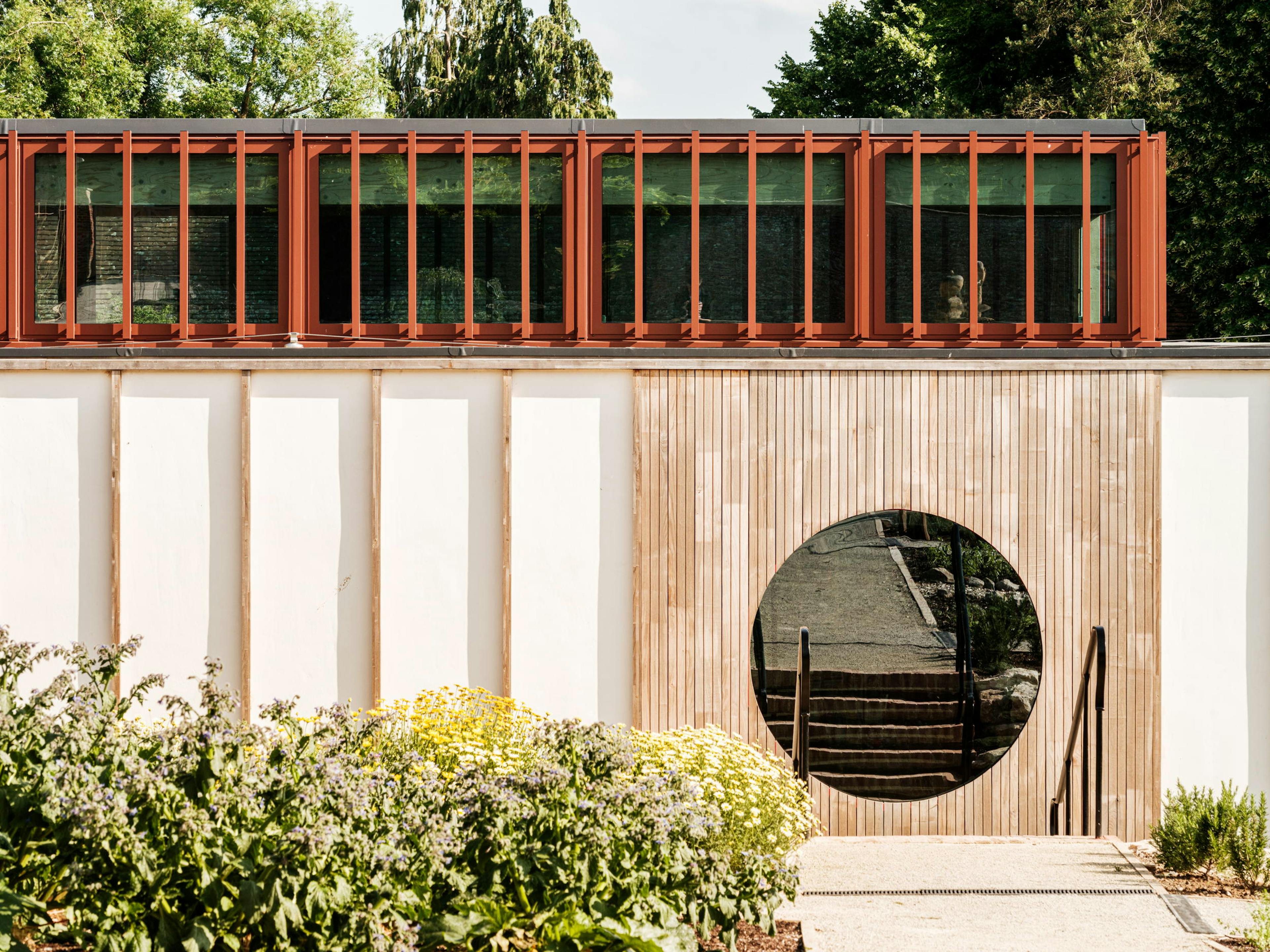 Partially cut into the hillside and clad in weathered timber the building is extremely discreet. Impact on trees and ecology has been minimised by carefully situating the building in a small opening in the woodland.
