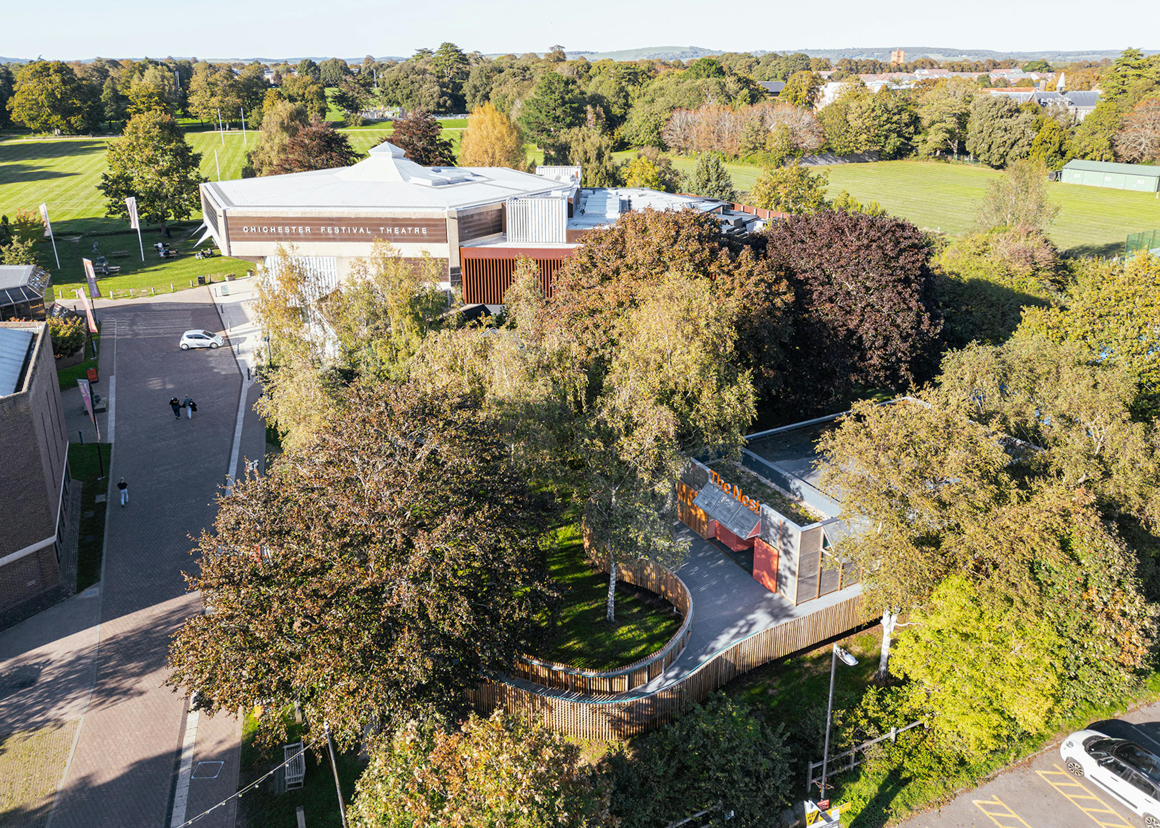 A modular theatre, nestled between trees, on the Chichester Festival Theatre campus