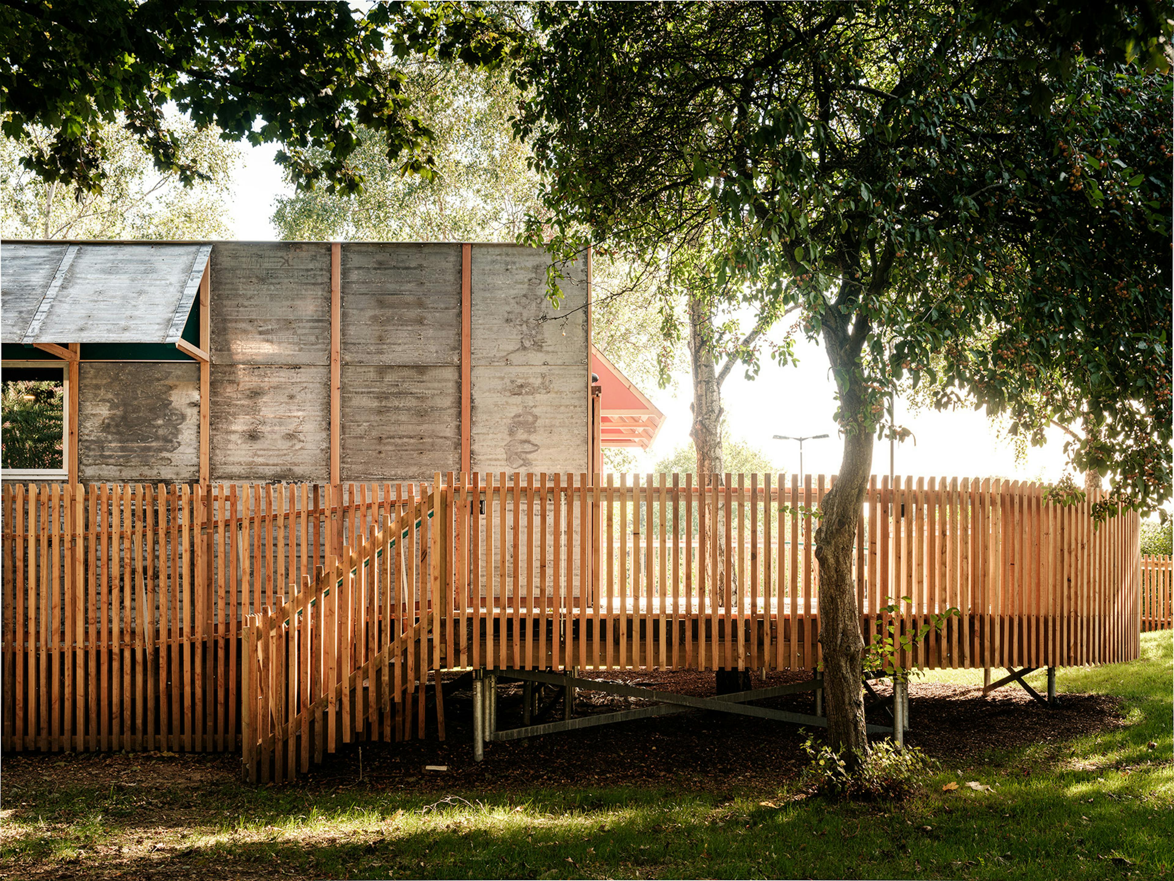The aluminium cladding panels are salvaged from a fairground dodgem ride, dating back to 1963, just a year after the CFT was constructed. The timber embossed panels are partially reflective and pick up the colours and movement of the trees and the sky, visually de-materialising the form.